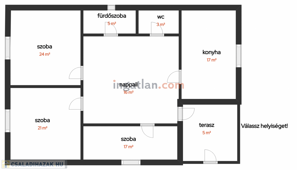 Az elrendezés kiváló: minden helyiség külön nyílik a nappaliból, élhető, jól átgondolt térkialakítással.