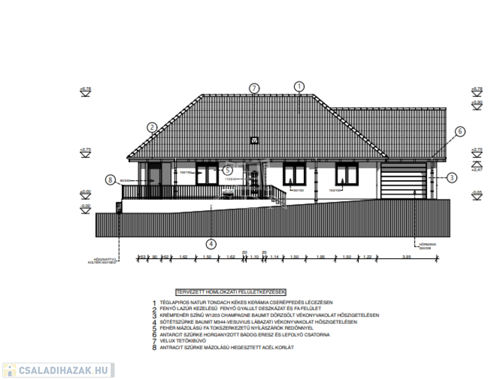 - nappali 26,94 nm,- konyha-étkező 11,26 nm, -háló 11,55 nm, -előszoba 5,28 nm (tetőtérre feljáró kialakítva, lehajtható létrával), -háló 11,36 nm, - háló 11,34 nm, -kamra 2,67 nm, - wc-kézmosó 2,52 nm, -fürdő-wc 5,53 nm, -garázs 19,71 nm, -gépészeti helyiség 2,15 nm, -közlekedő 5 nm, - fedett terasz 22,8 nm.