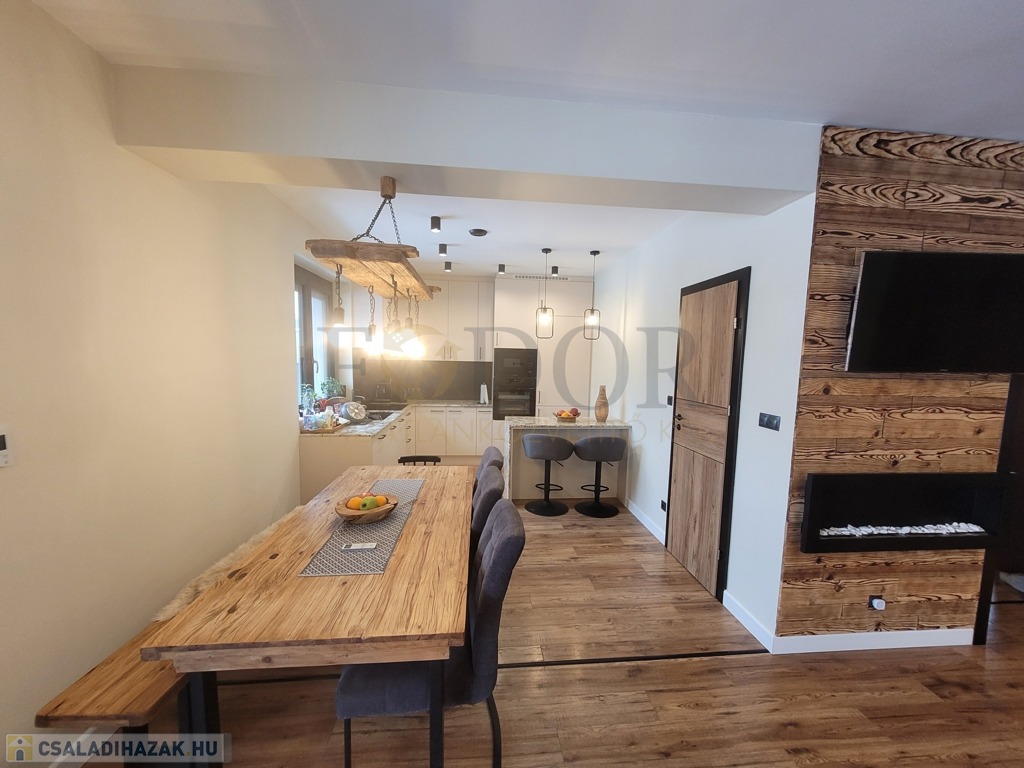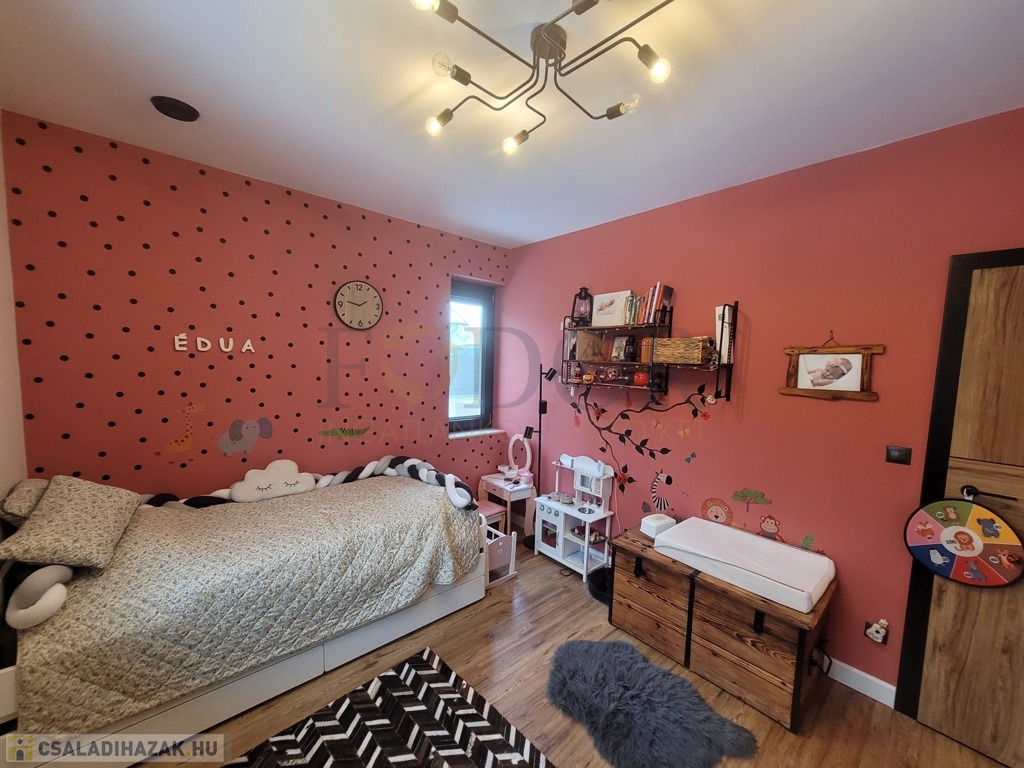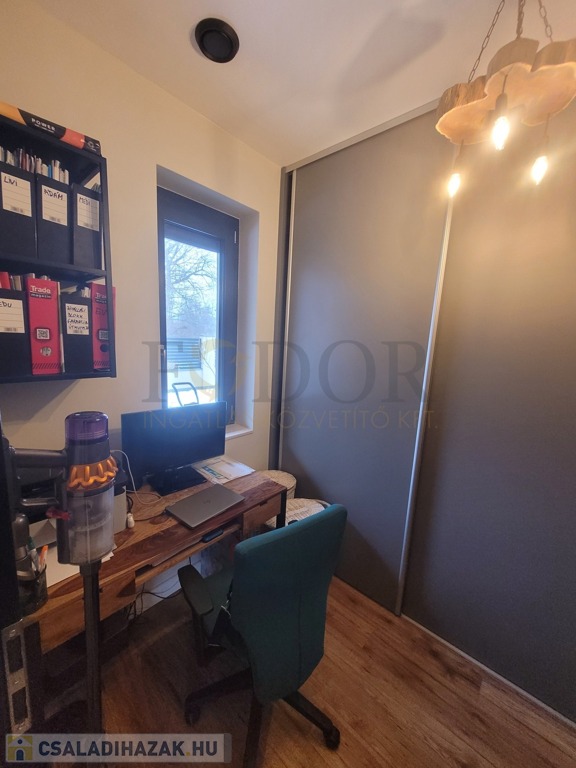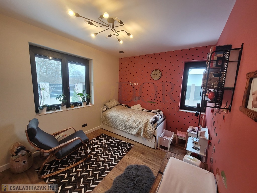 A tágas, amerikai konyhás nappali, kamra, két fürdőszoba-wc, három külön nyíló hálószoba, valamint egy dolgozó szoba és garázs teszi teljessé a kényelmet. Bár a tetőtér nem beépíthető, a lakótér maximálisan kihasználható. A prémium Daikin hószivattyú gondoskodik a fűtésről és meleg vízről, míg a ház központi Gree klímája biztosítja a friss hűvösét.
