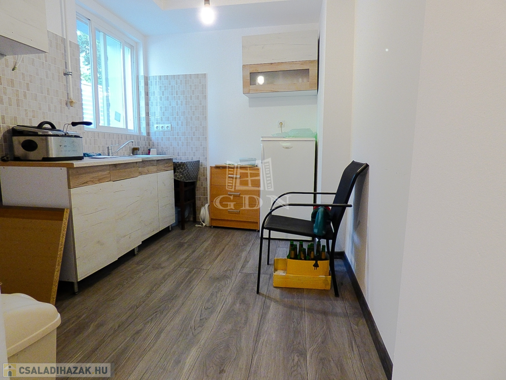 A kisebbik lakrész 35 nm-es, földszintes 1 szobával, fürdőszobával, konyhával nyerte el jelenlegi állapotát.