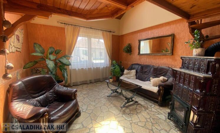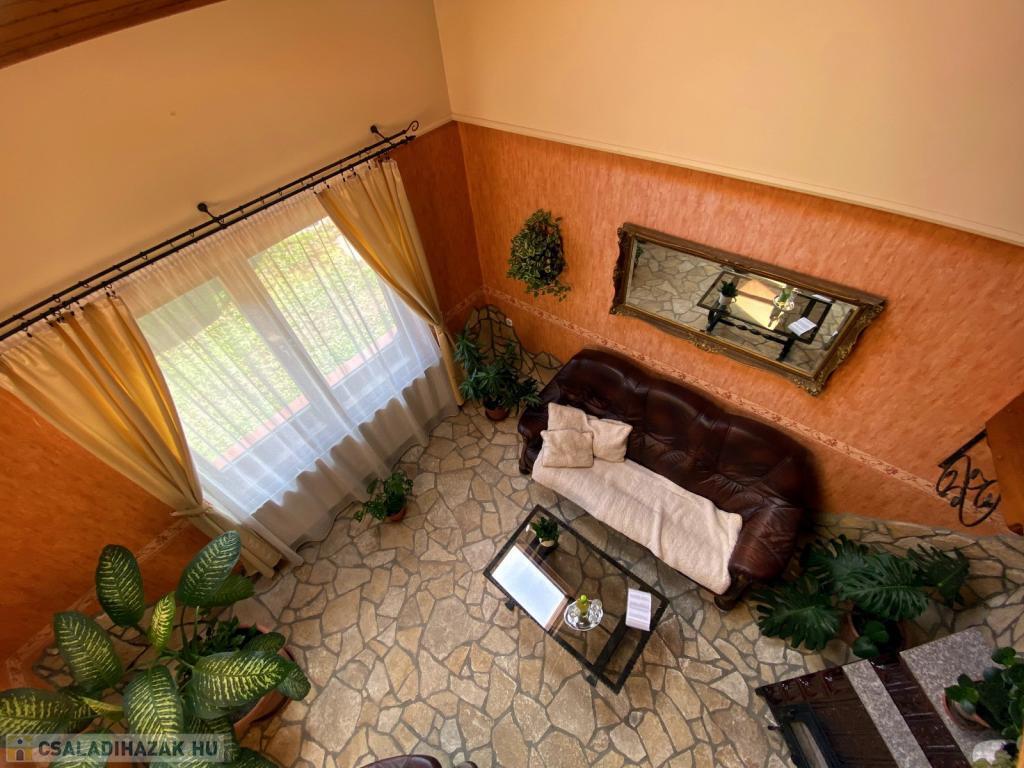 A tágas nappalit (kb.40 nm) spanyol csempe és természetes homokkő burkolja, a mennyezetet fa burkolatok díszítik, melyek melegséget és karaktert adnak a térnek. Ideális helyszín meghitt családi ebédekhez és baráti összejövetelekhez, ahol jókat lehet enni, nevetni, együtt lenni. Itt a belmagasság 4,40 cm, így állógaléria növeli az életteret, ahol kellemes könyvtárszoba, dolgozórész, iroda lett kialakítva, a home-office-ban dolgozók örömére.