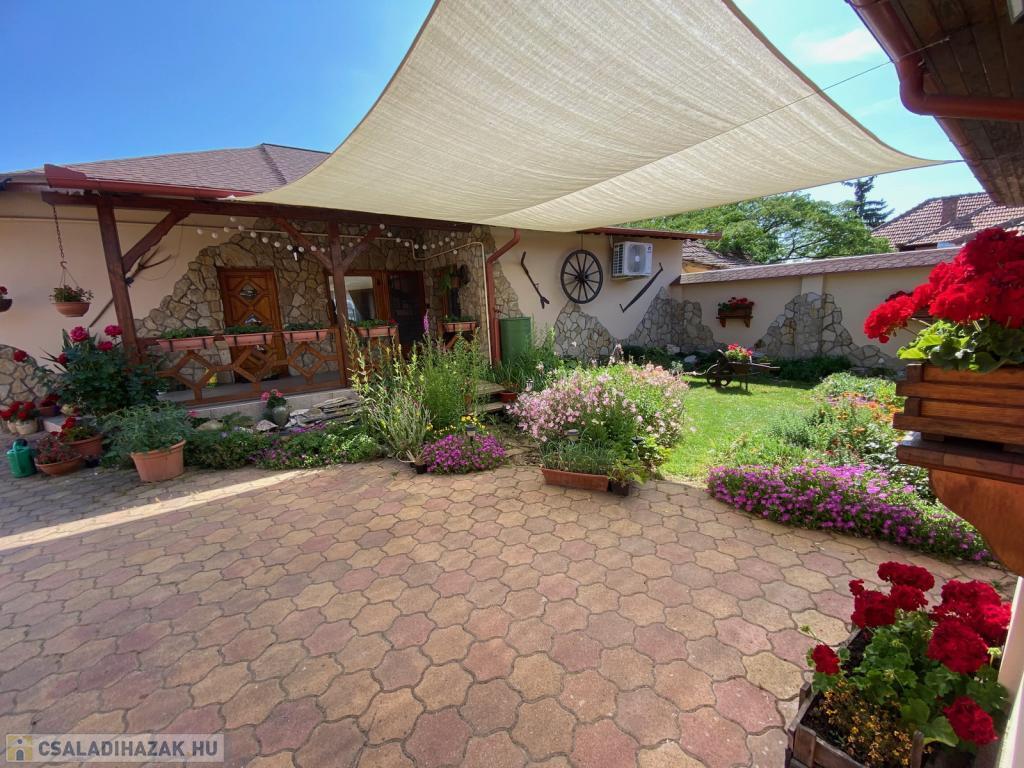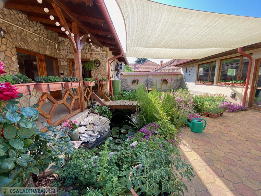 A bejárat előtt fedett terasz hív pihenésre, az udvar nagy részét térkő borítja, és egy mesésen kialakított, csodás virágos gondozott kert, kis tó halakkal, tavirózsákkal és hangulatos híd, igazi kis édenkert. Én teljesen beleszerettem, ezt látni kell!
