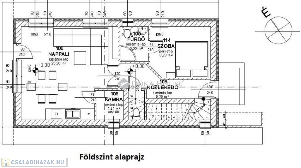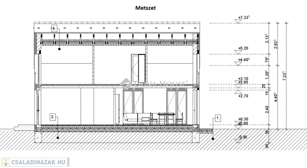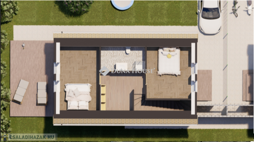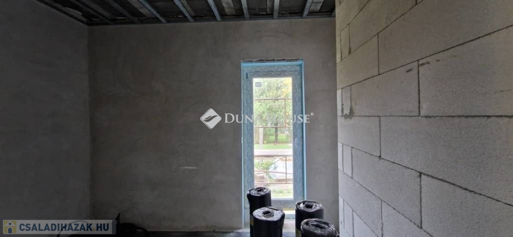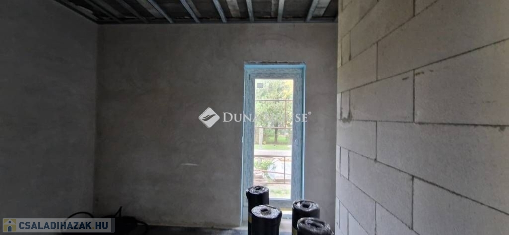Egy telken belül - megosztott használatban - két egyforma ház épül. Ehhez az ingatlanhoz 234 négyzetméter alapterület tartozik. A telken elhelyezkedő ház 103 négyzetméter. Két szintet kapott. Az alsó szinten kialakításra került egy nappali + konyha, egy szoba, fürdőszoba + WC, közlekedő, illetve egy kamra. A nappaliból nyílik a terasz, ami 18 négyzetméteres. A lépcsőn feljutunk a tetőtér közlekedőjébe, ahonnan külön nyílik két szoba, illetve egy zuhanyzó + WC.