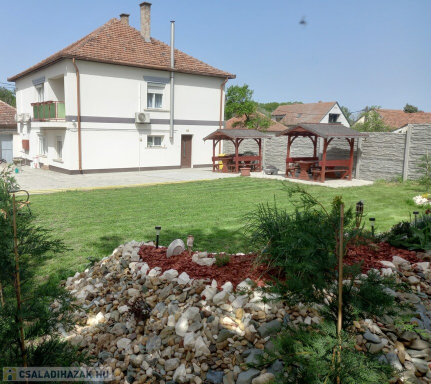 Az udvar ház közeli része térkövezve. Udvaron fedett kiülők és háttérvilágitás nyújt kellemes hangulatot. A füvesített hátsó udvar, virágágyás és csobogó tovább emeli a szinvonalát.
