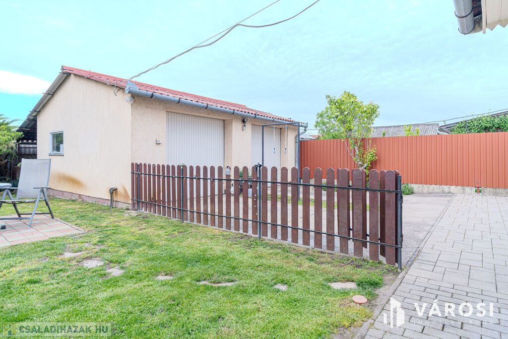 A 435 nm-es telek hátsó részén parkosított pihenőkert található. Az udvar igényesen térkövezett, a bejutást pedig elektromos kapu teszi kényelmessé.