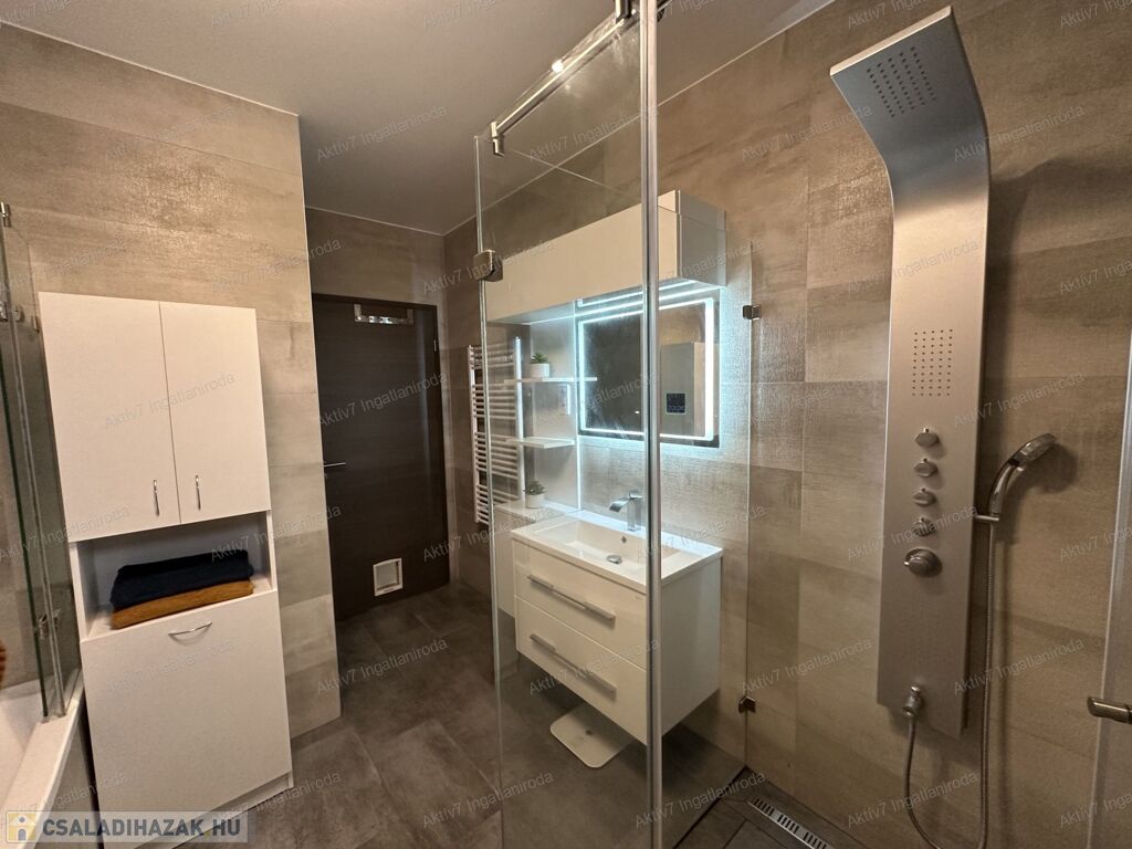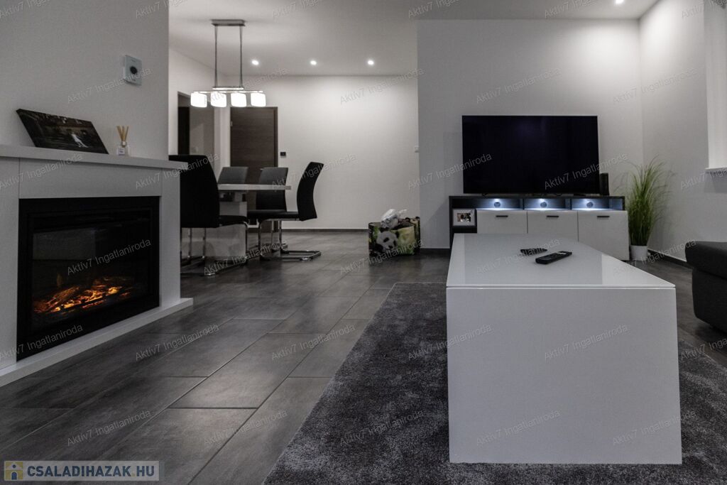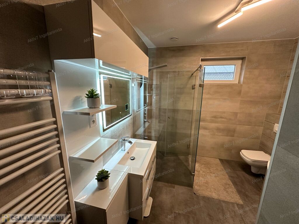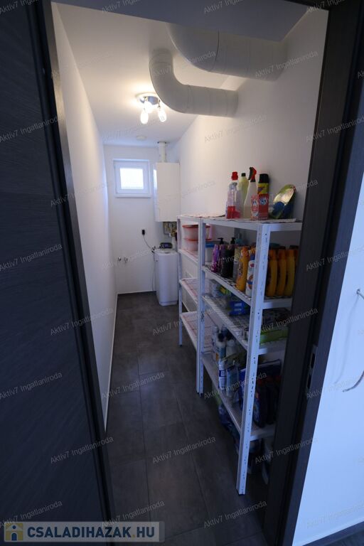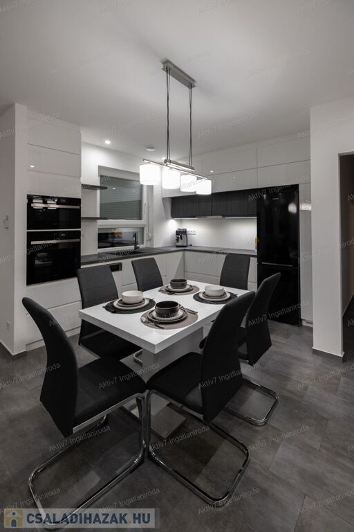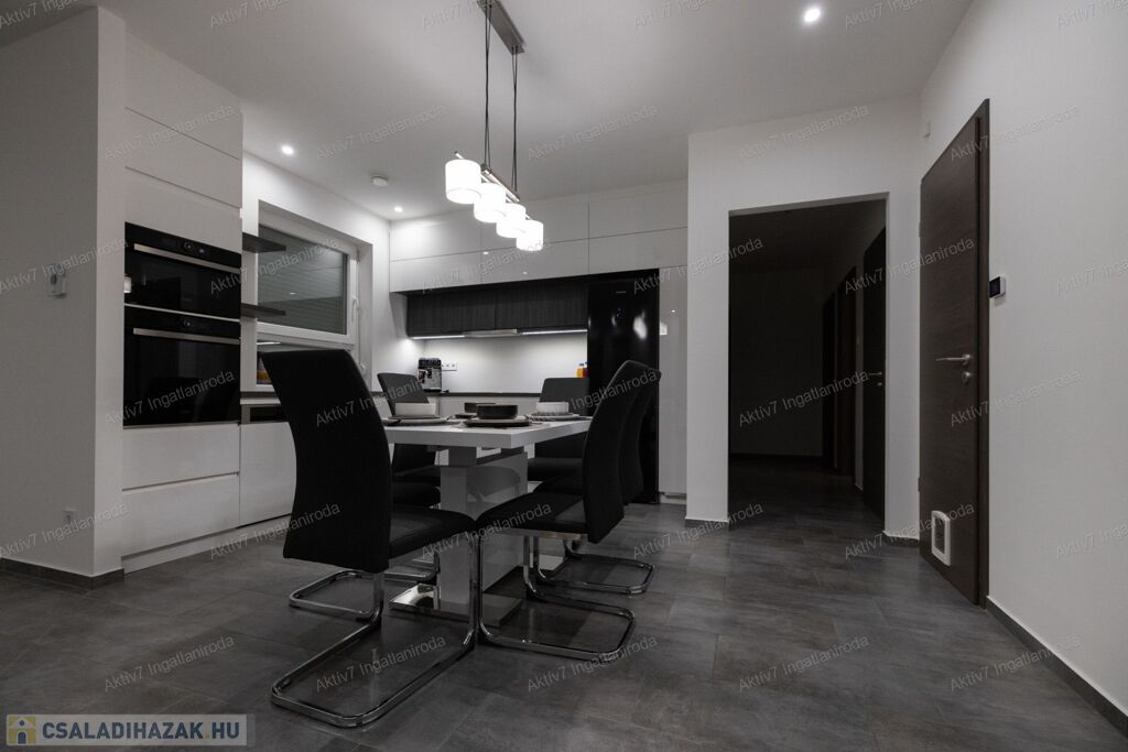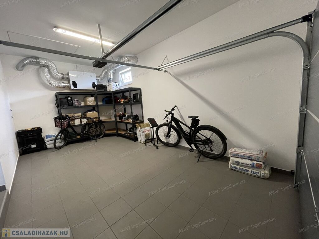 A ház modern felszereltséggel rendelkezik: Bosch kondenzációs kazán padlófűtéssel és okos vezérléssel, központi hővisszanyerős szellőztetőrendszer, 2 darab Panasonic hűtő-fűtő klíma, vízlágyító berendezés, 8 kamerás biztonsági rendszer és riasztó. A beépített konyhabútor minőségi kivitelezésű, Whirlpool gépekkel felszerelt (sütő, mikró, mosogatógép, indukciós főzőlap).