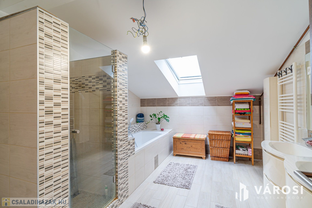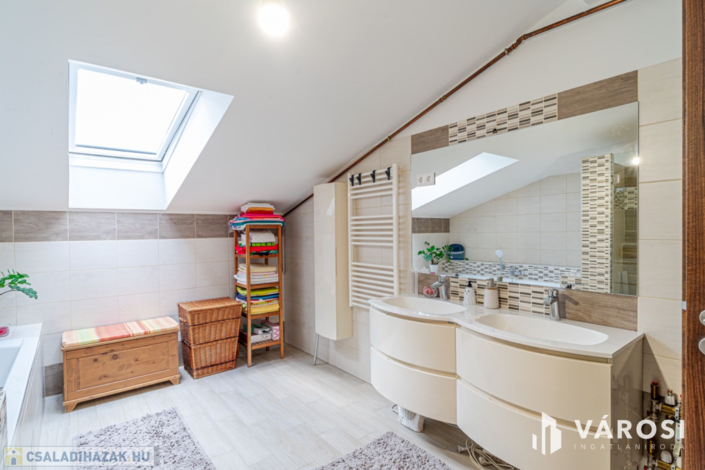 A ház, egy 46 nm-es amerikai konyhás nappalival, összesen 5 hálószobával - melyből 2 a földszinten található - , és 2 fürdővel - a földszinti tusolóval és w.c.- vel, az emeleti káddal, tusolóval, és w.c.-vel - , valamint háztartási helyiséggel, előtérrel, közlekedőkkel, rendelkezik. Központi része a "szemmel alig látható " amerikai konyha nappali, amely számtalan családi programnak adhat helyet, és innen könnyen elérhető nem kis méretű terasz és a hozzátartozó kiválóan kezelt udvar is.