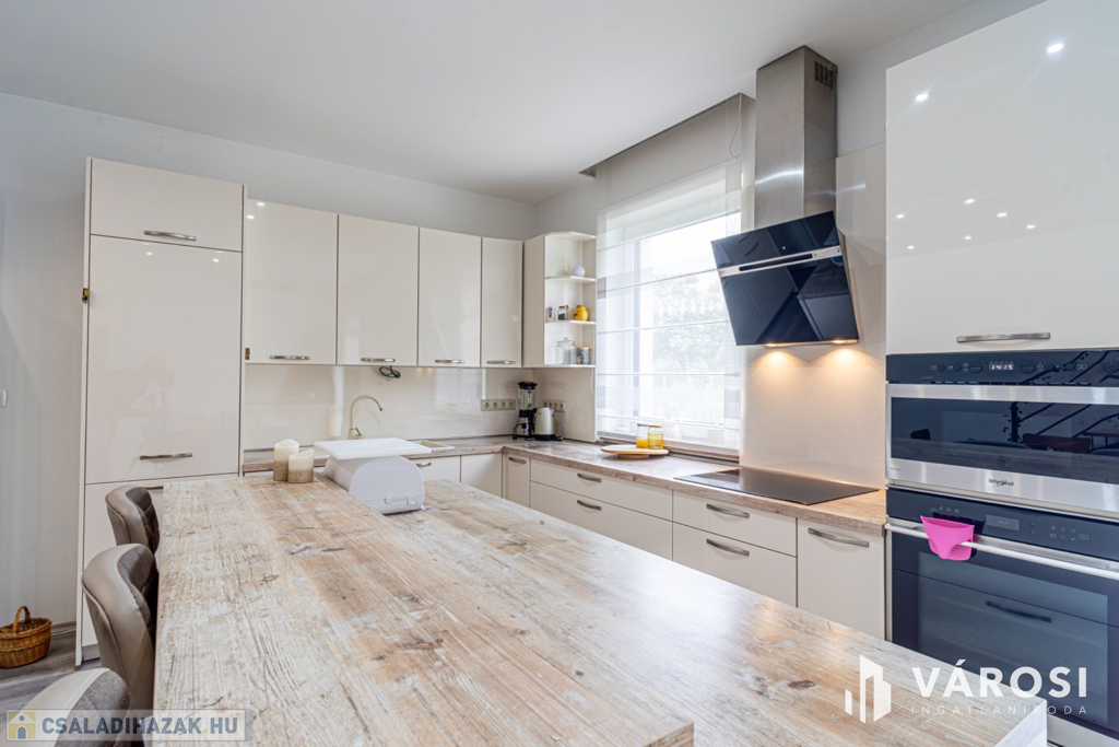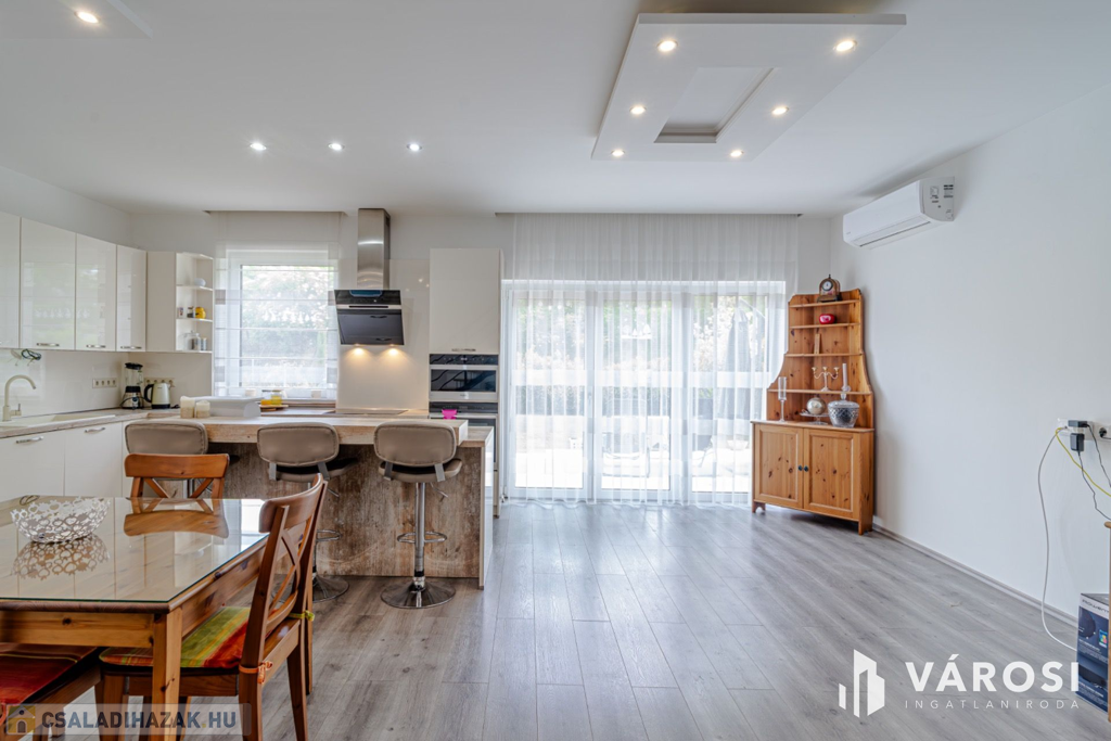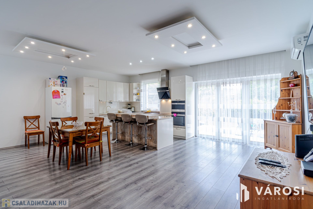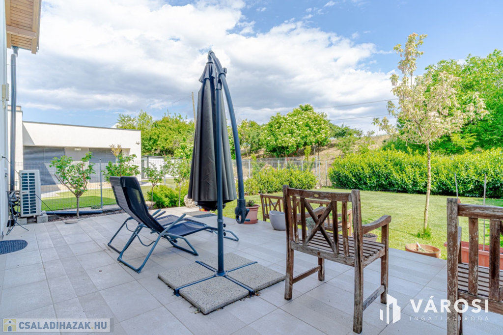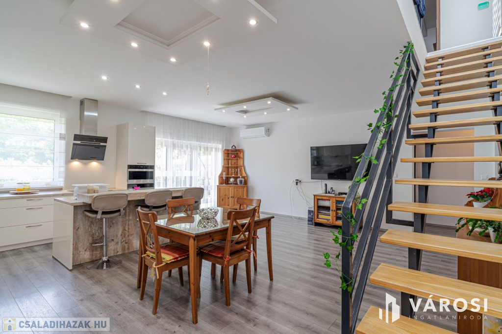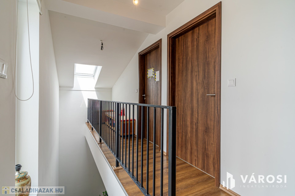 Szeged Újszeged a Lőtér lakóparkban, eladó egy 2019-ben épült, Kiváló állapotú, 135 nm-es élettérrel rendelkező ,tégla építésű, gáz cirkó fűtésű, 4 kw - os napelem rendszerrel ellátott, nappali plusz öt szobás, dupla fürdős, belső szintes, erkélyes,,teraszos (34 m2), ikerház, amelyhez egy 20,5 nm-es garázs, és összesen 380 nm es telek is jár hozzá parádés kerttel.