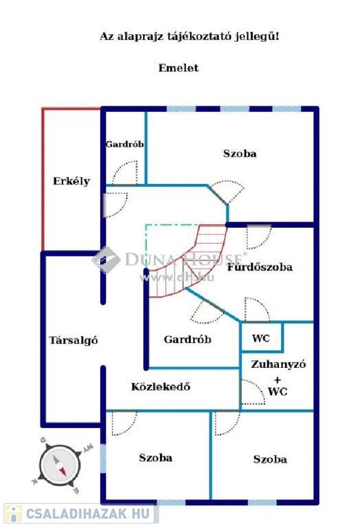 Az emeletre kényelmes, elegáns lépcsőn jutunk fel. Ezen a szinten két lakószárny került kialakításra, melynek központi része a társalgó. Előtérrel szemben 10,44 m2-es terasz nyílik, jobbra egy gardrób szoba ad lehetőséget a tárolásra, tovább haladva a szülői háló, a fürdőszoba, az innen nyíló külön légtérben kialakított wc és egy gardrób érhető el. A közlekedőből nyílik a kissé elszeparált 2 külön bejáratú hálószoba, a fürdő és a kézmosóval felszerelt mellékhelyiség.