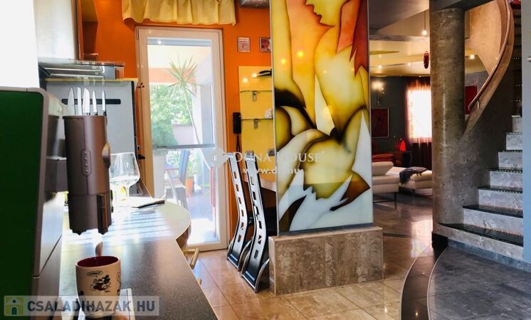 A ház helyiségeinek színvilága, burkolatai a mediterrán stílust képviselik, így együttesen egy nagyon kellemes, otthonos megjelenést sugároznak. A terek felosztása jól átgondolt, ennek köszönhetően nagyon kellemes atmoszférájú az ingatlan.