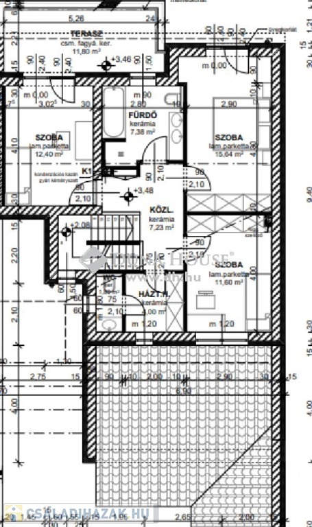 3 hálószoba (12,40, 15,64, 11,60), fürdőszoba, háztartási helyiség, emeleti terasz
