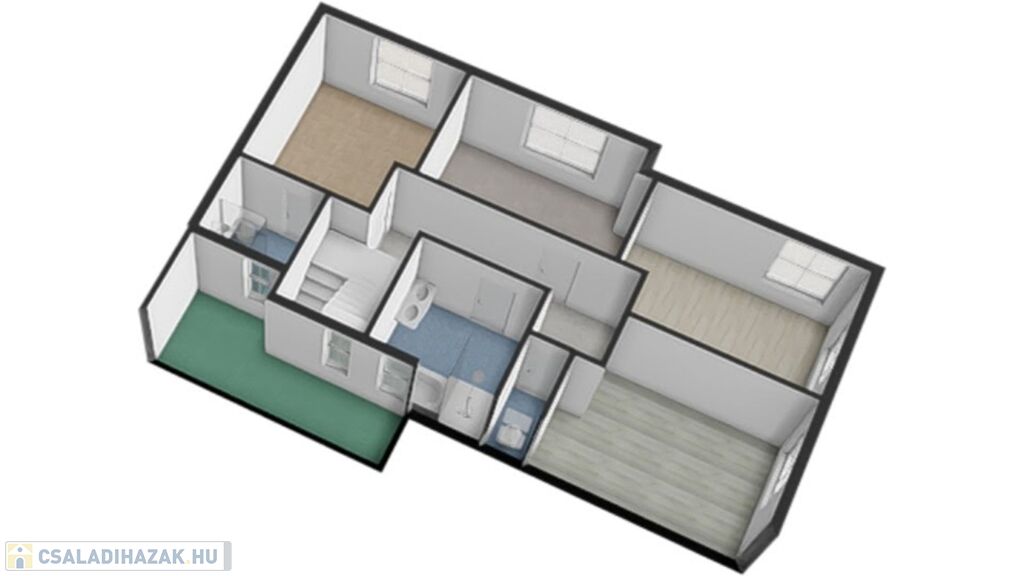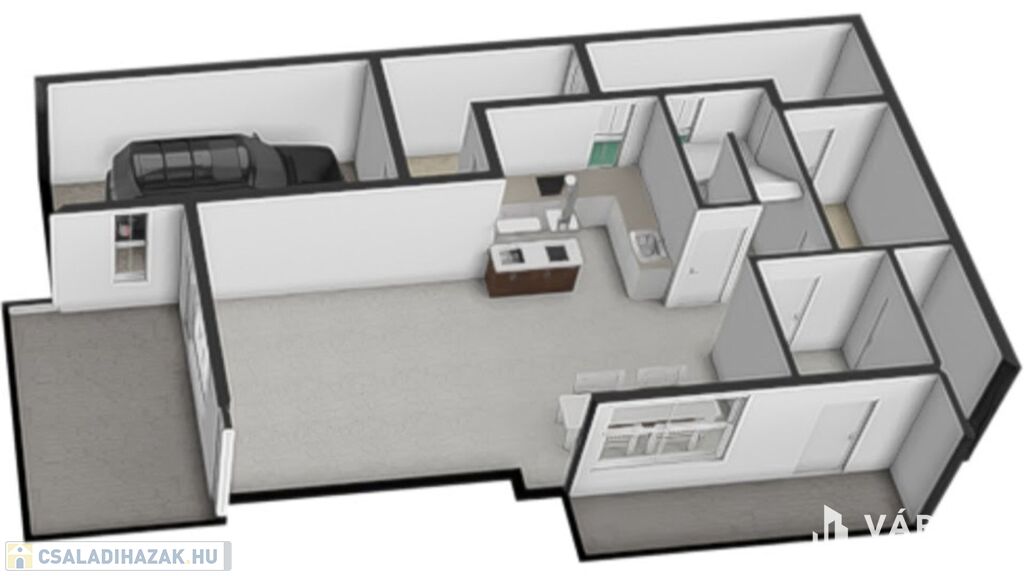 - Nappali, konyha,3.szoba, 1 fürdő, 2 WC, gardrób, háztartási helyiség, tároló,garázs,terasz.patio.