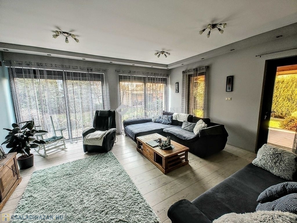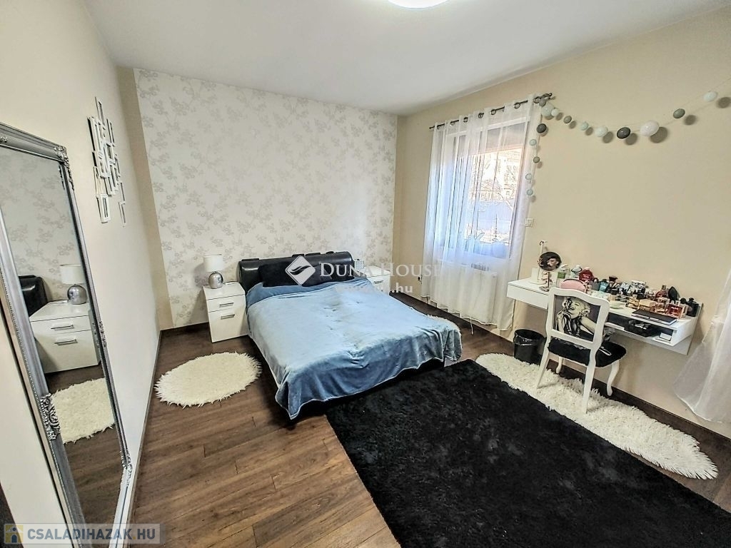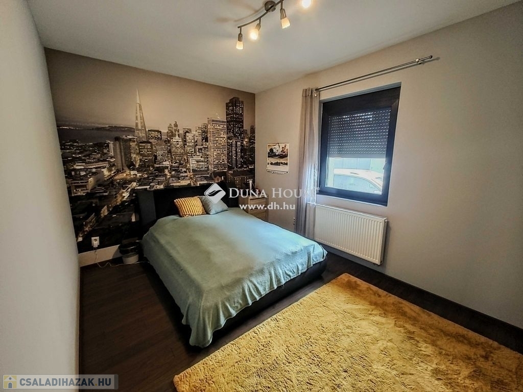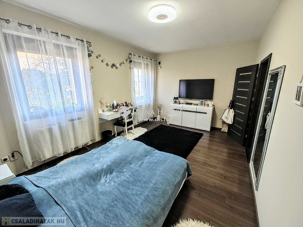 Ez a modern, 2013-ban elkészült ingatlan 160 m² lakótérrel, 40 m² fedett terasszal és 744 m² parkosított telekkel kínálja a kényelmes otthon lehetőségét. A ház építésekor korszerű anyagokat és technológiákat használtak, beleértve a modern műanyag nyílászárókat motoros alumínium redőnyökkel és szúnyoghálókkal, valamint a radiátoros és padlófűtés kombinációját, melyet kondenzációs kazán szolgál ki. Az elektromos hálózat szintén új és korszerű kialakítást kapott, az udvar pedig elektromos kapuval felszerelt.