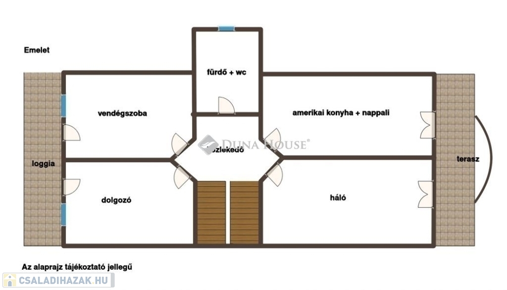 A felső szintre igényes lépcső vezet, ahol amerikai konyha + nappali, 3 külön bejáratú szoba és fürdő került kialakításra. A környezettel való kapcsolatot loggia biztosítja, mely a nappaliból és a szobából is megközelíthető.
