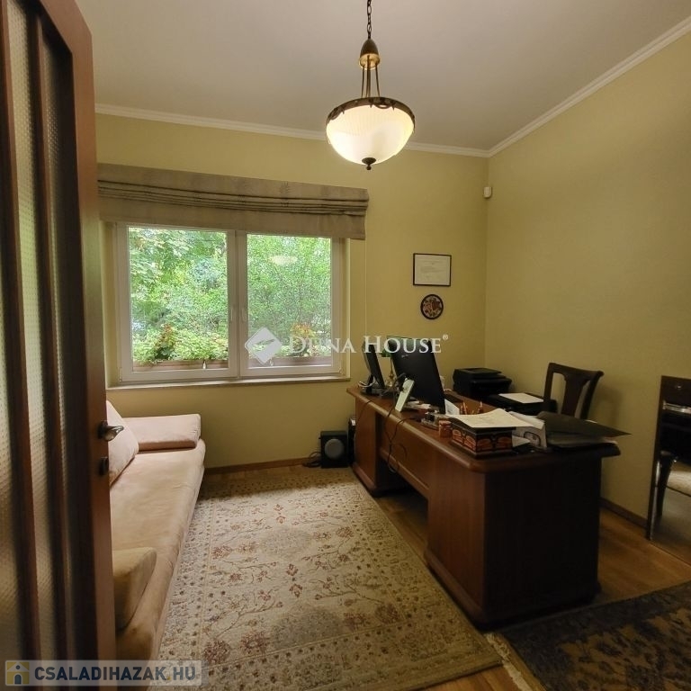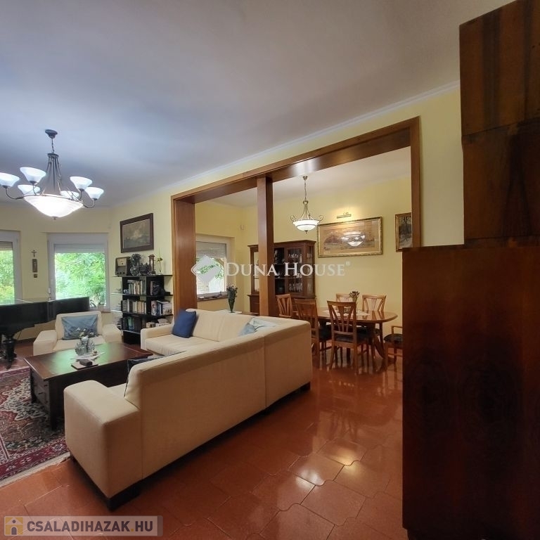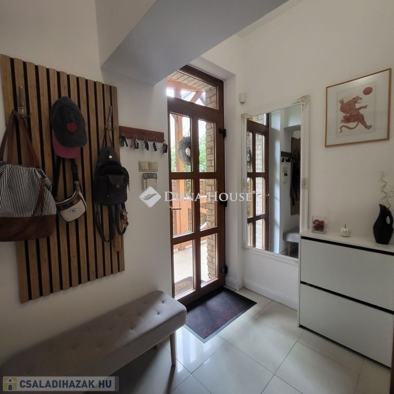 Földszint: impozáns előtér és közlekedő, nappali közvetlen teraszkapcsolattal, dupla konyha étkezővel, spájz, egy szoba, fürdőszoba WC-vel, külön vendég-WC.