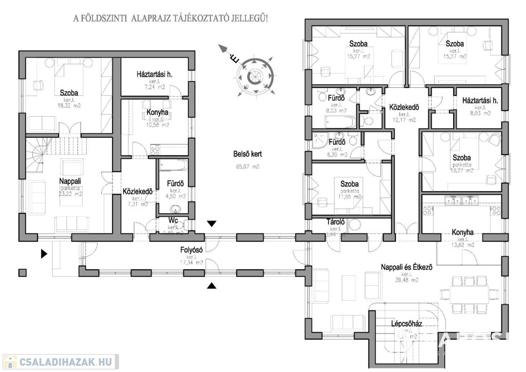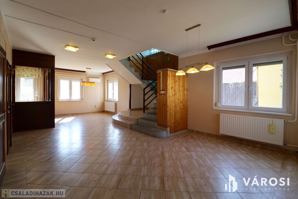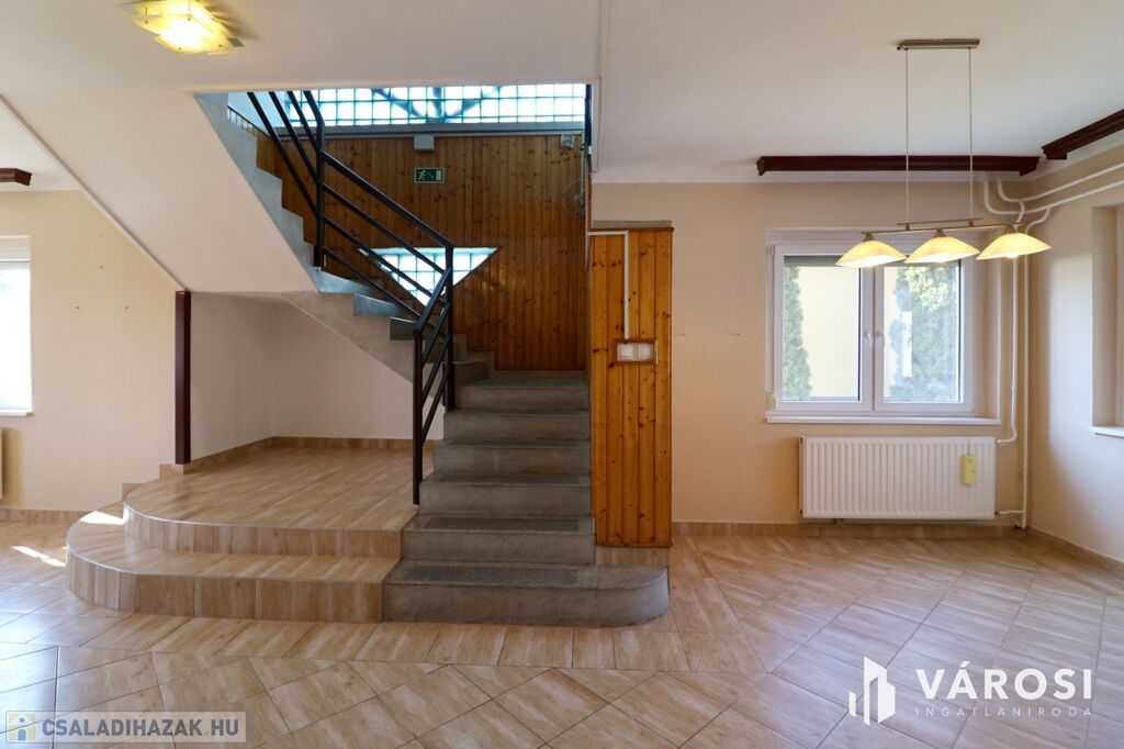 nappali, étkező. konyha, 4 szoba, 2 fürdőszoba, + külön álló wc, háztartási helyiség, tároló, közlekedő, lépcsőház