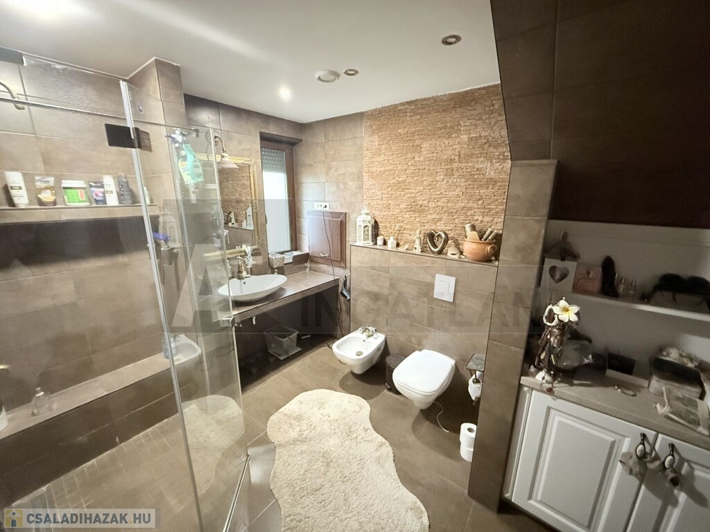 A két szintes, 198 m2-es ház + közvetlen a nappalihoz kapcsolódó, 20 m2 téliesíthető terasz és a kert végében megépített, szintén teljesen felszerelt, téliesíthető, grill terasz , fürdőszobával, wc-vel: