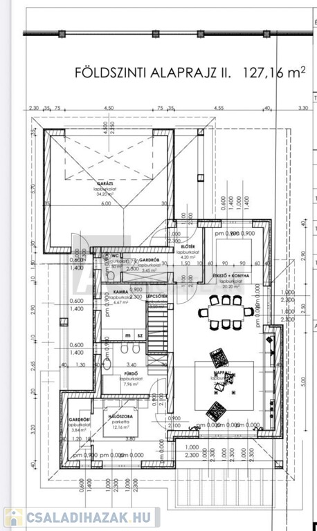 -földszint elrendezése: 34 m2-es garázs , előtér , gardrób, vendég mosdó , kamra és háztartási helyiség és a mediterrán otthonok központi tere a napfényes amerikai konyhás nappali , a közösségi élet színtere , amely elhúzható üvegajtóval kapcsolódik a teraszhoz és mediterrán parkosított kerthez, medencéhez,