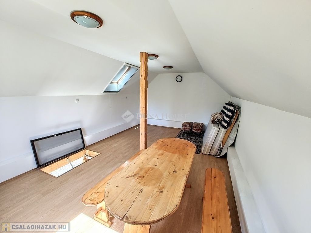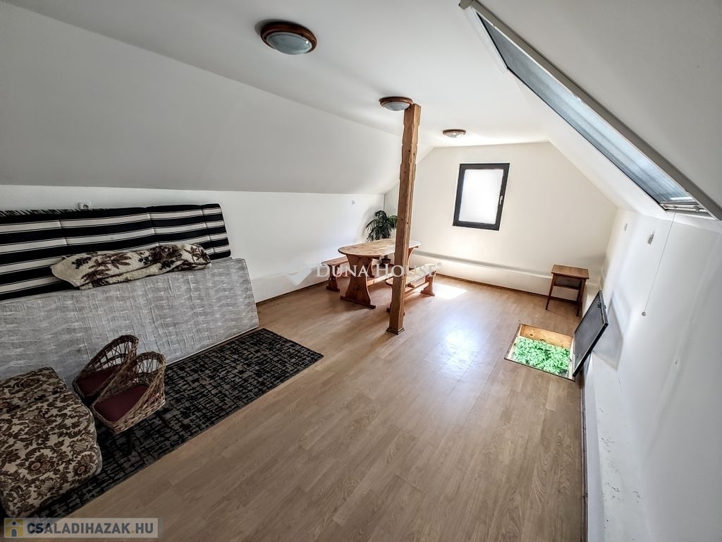 Különlegessége a tetőtérben található, 24 m²-es nagyszoba, amely ideális lehet baráti összejövetelekhez, pihenéshez vagy akár hobbiszobának is. A kertben kiépített kültéri zuhanyzó a nyári időszakban különösen kényelmes megoldást kínál.
