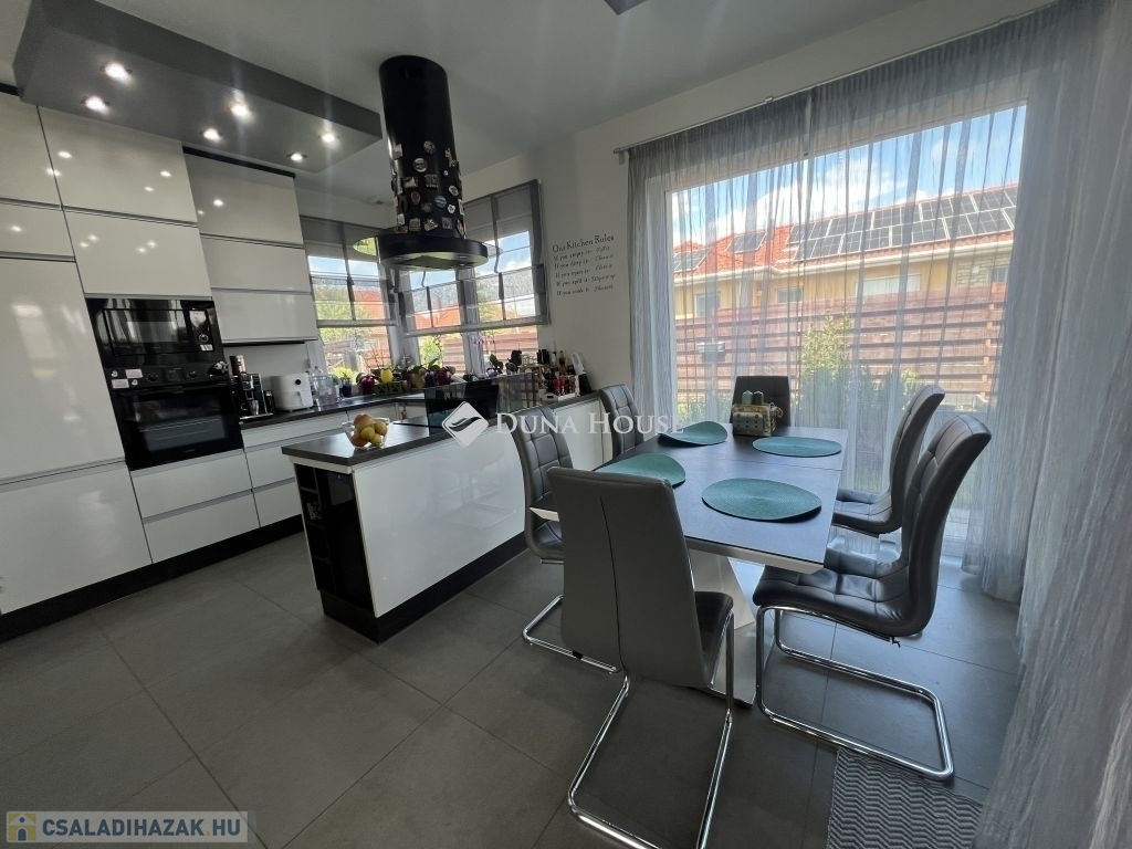 A fűtést és hűtést modern hőszivattyú biztosítja, amely a padlófűtéssel kombinálva gondoskodik az ideális hőmérsékletről az év minden napján. A tetőre telepített 11,4 kW-os napelemrendszer jelentősen csökkenti a rezsiköltségeket, így a fenntarthatóság a mindennapok részévé válik.