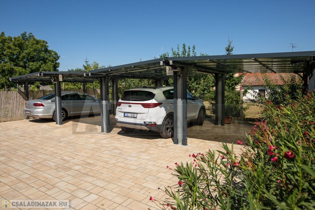 A parkolás két autó számára a garázsban, két autónak az udvaron úgy, hogy a mozgásban a 4 autó nem zavarja egymást. Emellett az utcán a ház előtt további 3 autó parkolhat.