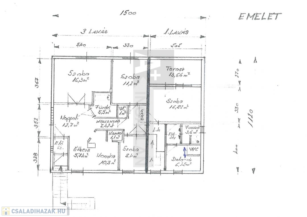 III. lakás: Tetőtéri 74,6 m2. Három szoba, konyha – étkező, kamra, fürdőszoba, külön álló WC és egy szélfogó.