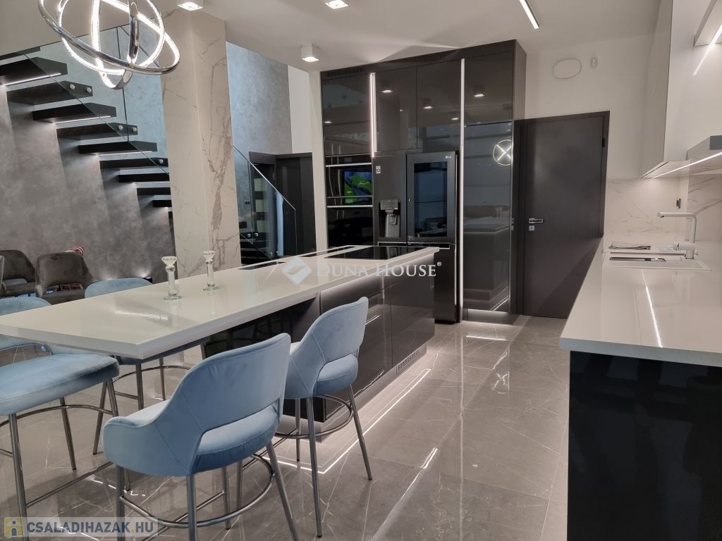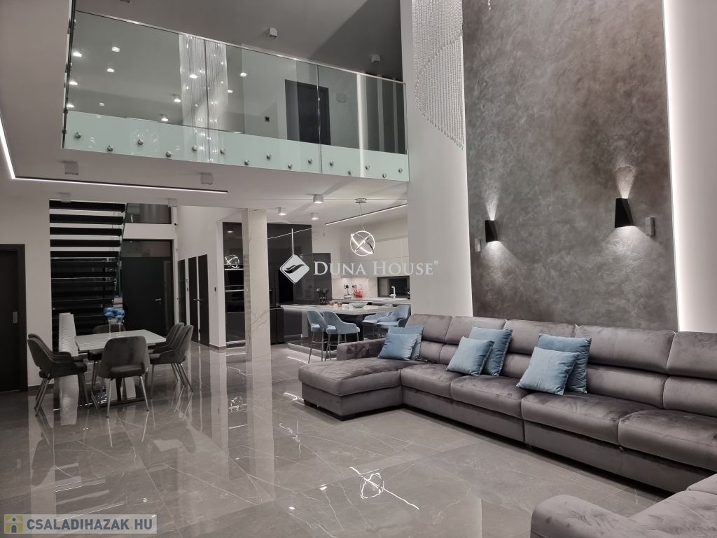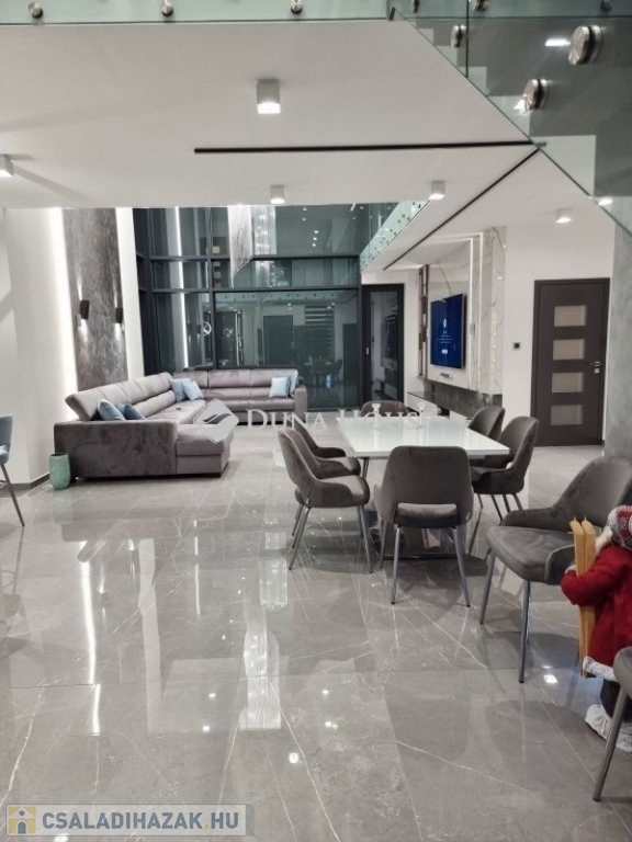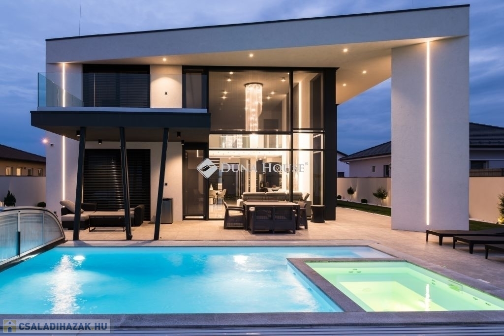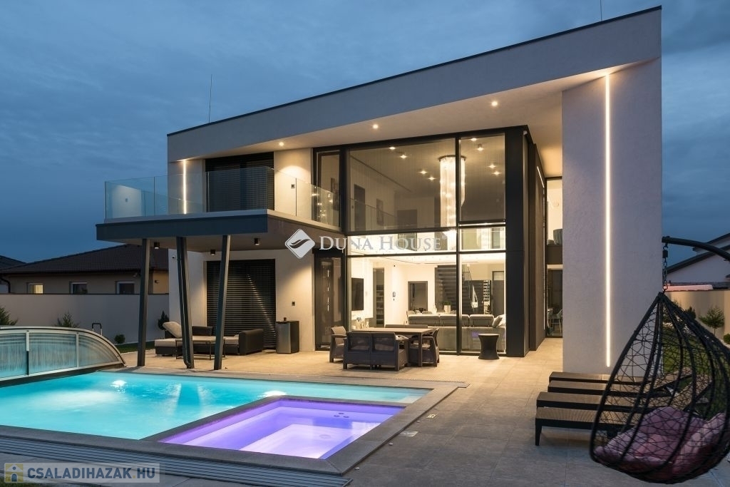 A Liliom Lakóparkban eladó egy 2021-ben épült, közel 400 m²-es, két szintes panorámás villa, prémium anyagokkal és modern technológiával.