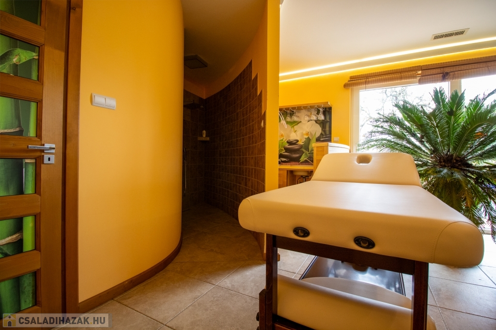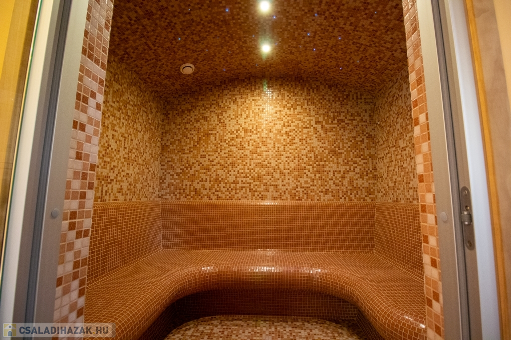 - Wellness részleg (100 m²): kombinált szauna (finn/infra), kőgőzkabin, pihenőtér