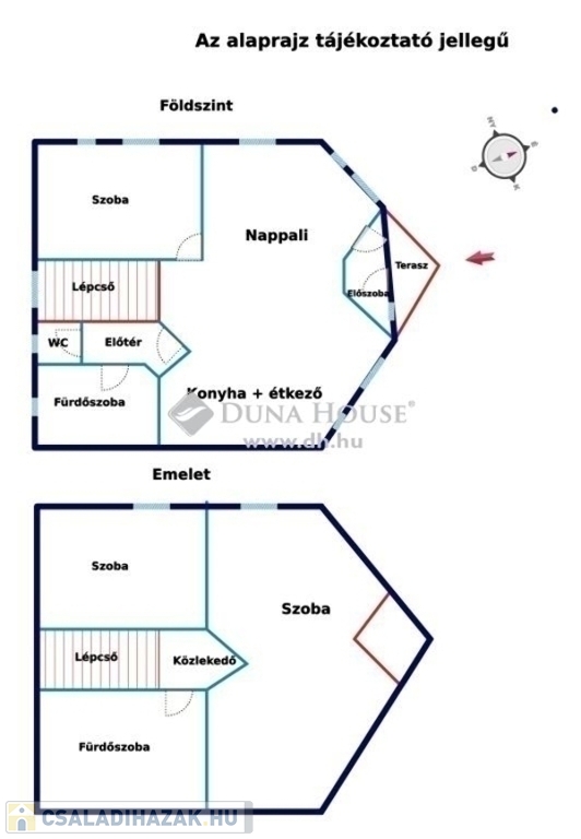 Emelet: Majdnem szerkezetkész állapotú, kreatív átalakítási lehetőségekkel. Az emeleten egy közlekedő, két szoba (30 m² és 11 m²), valamint egy fürdőszoba található.