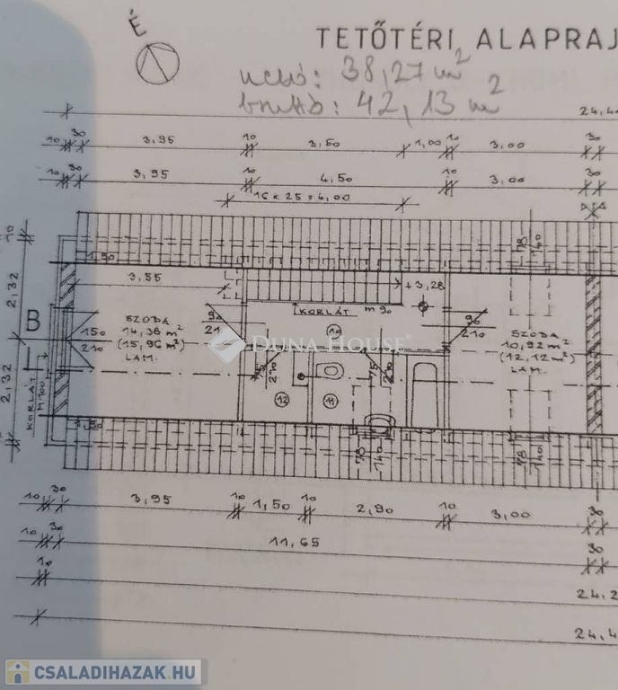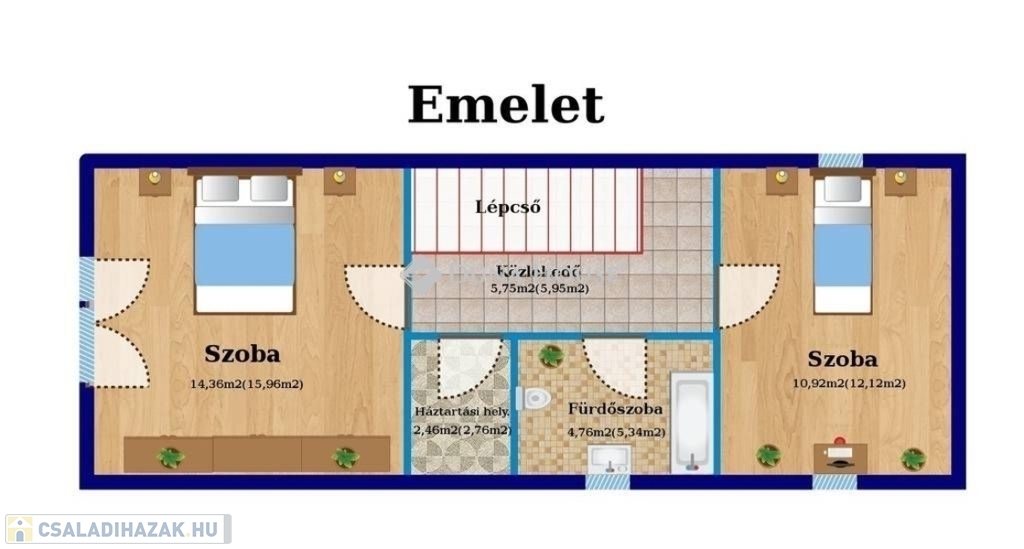 Emelet: két szoba (14,36 és 10,92 m²), háztartási helyiség, fürdőszoba + WC, közlekedő