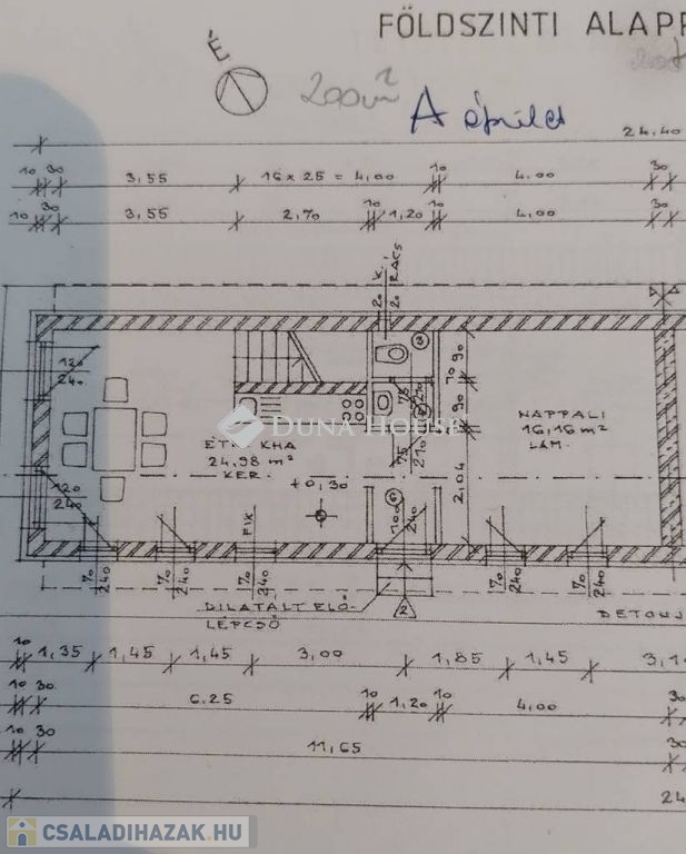 Földszint: nappali (25 m²), konyha-étkező, szélfogó, WC, lépcsőfeljáró