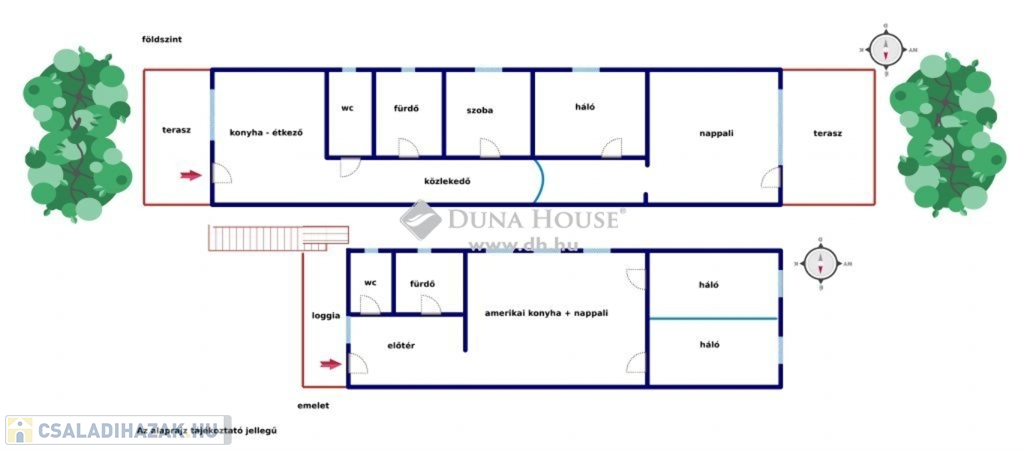 Emelet: amerikai konyha+nappali, szoba, fürdő, toalett, előszoba, loggia = 58,4 m2