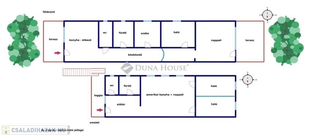 Emelet: amerikai konyha+nappali, szoba, fürdő, toalett, előszoba, loggia.