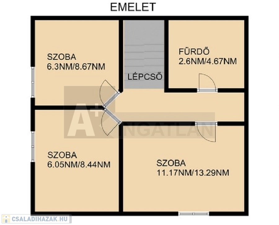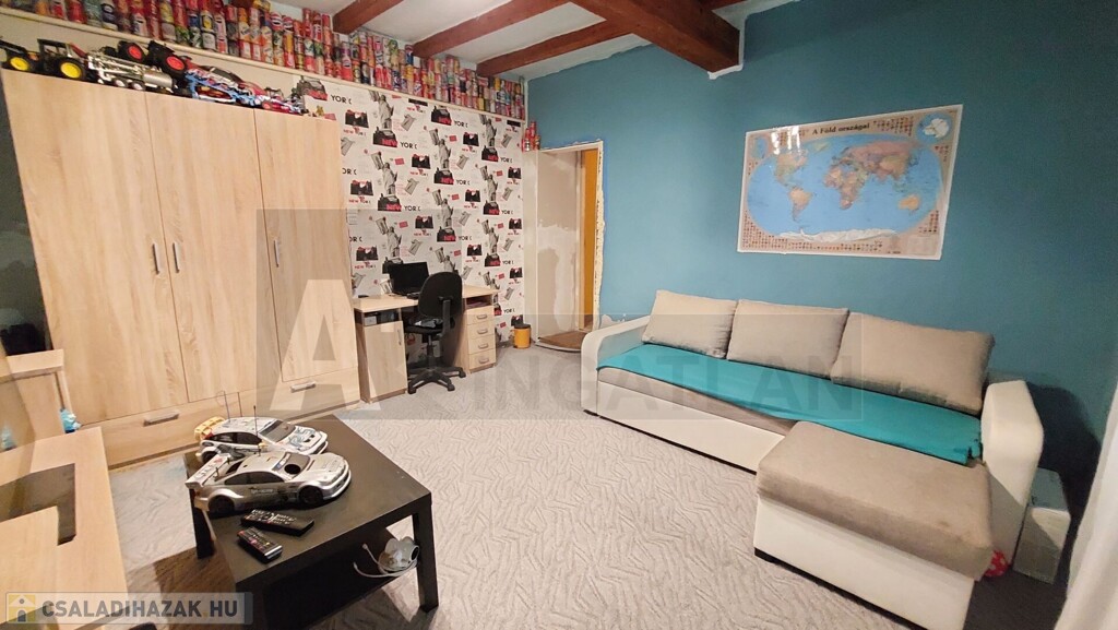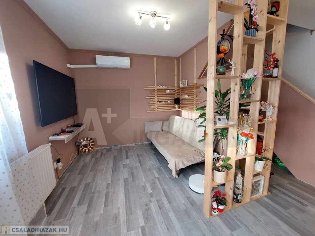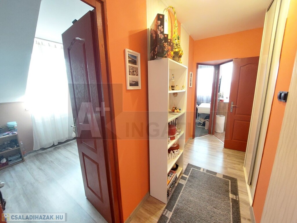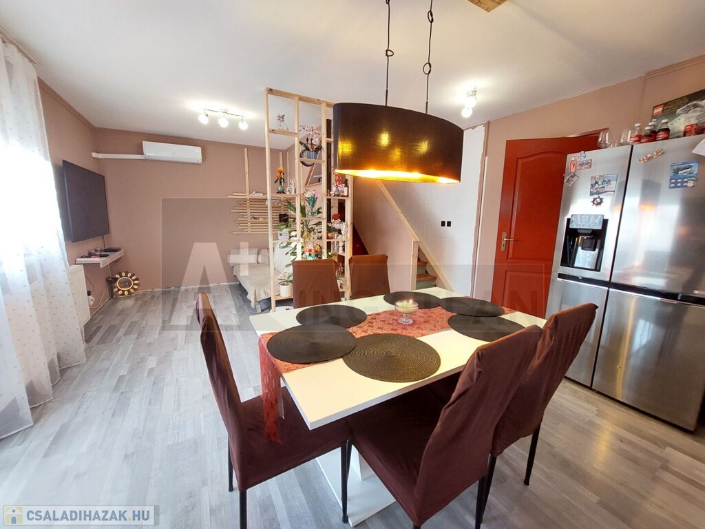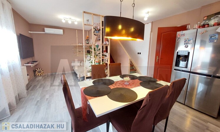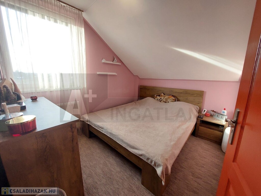 - kétszintes, földszintjén amerikai konyhás nappali, fürdő, wc, előszoba, emeletén három hálószoba, fürdőszoba, közlekedő