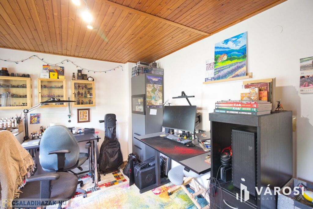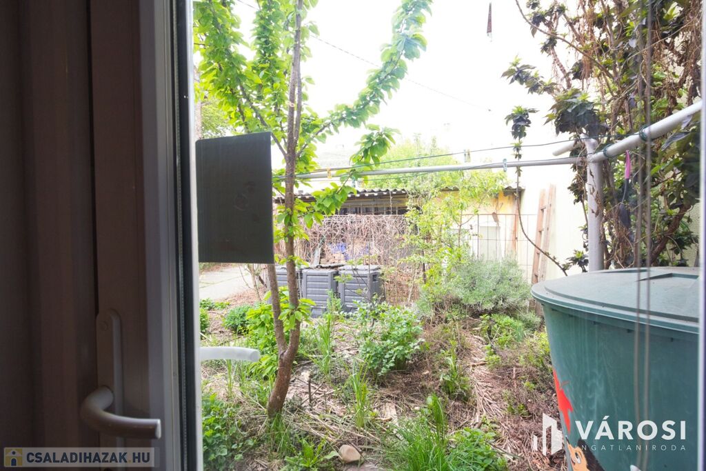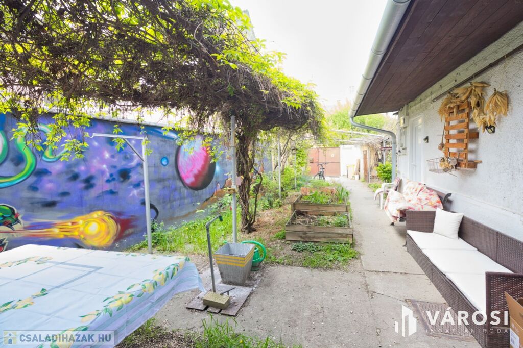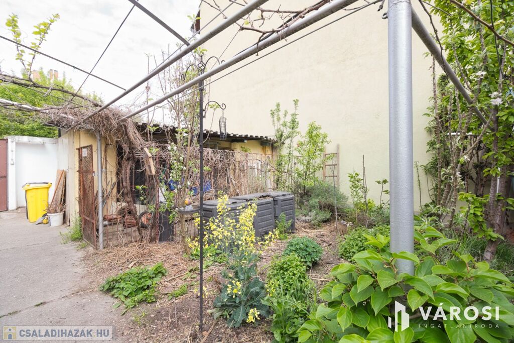 A kertben nagyon szép lugas lett szőlőből kialakítva, de 1-2 tő paradicsomnak, paprikának is marad hely. Az autónak pedig 15 m2-es garázs.