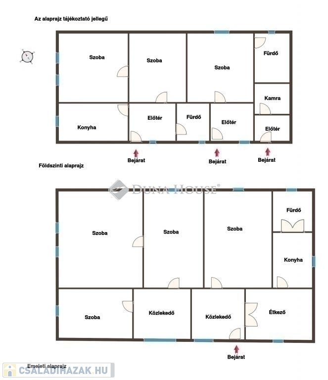 Felső szint: 4 szoba, konyha, fürdő, kamra, étkező, közlekedő