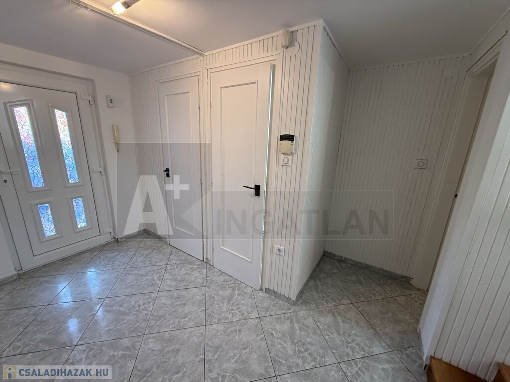alsó szint : garázs fürdő és külön mosdó + félszint : tágas, napfényes nappali + terasz kapcsolattal és lejárattal a kertbe ,