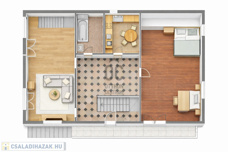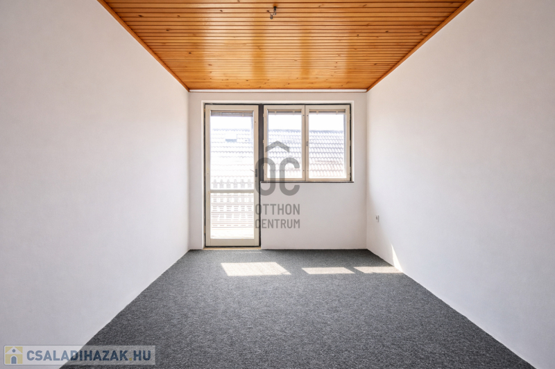 • 100 m², külön bejáratos emelet + tetőtér: nappali–konyha–étkező + 3 hálószoba, 2 fürdőszoba