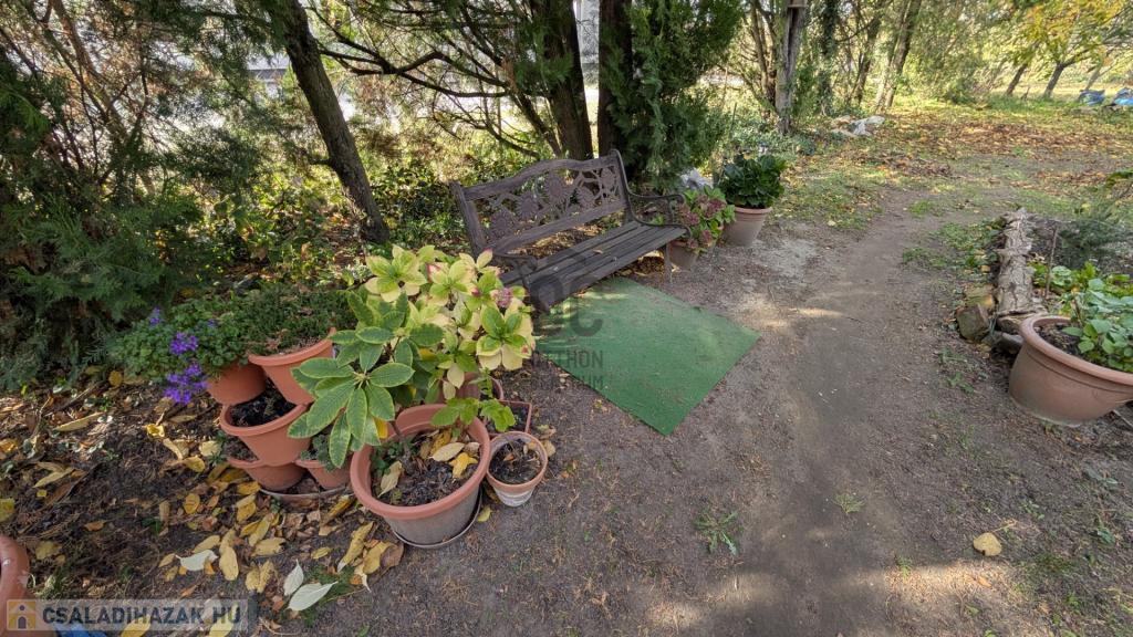A kertben örökzöldek, gyümölcsfák, füves terület, valamint fúrt kút található.