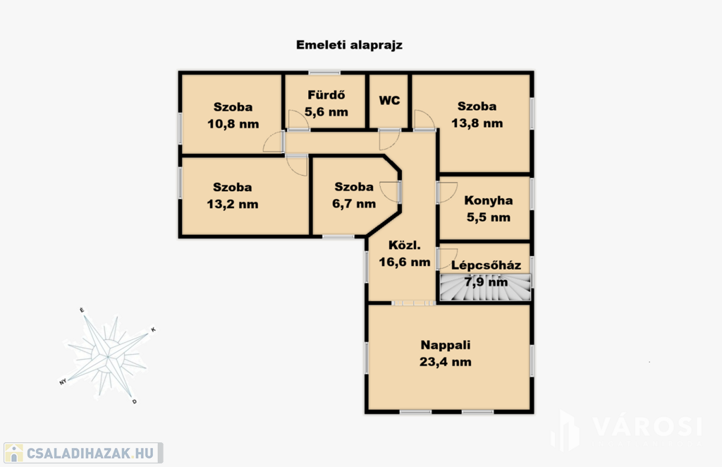 A tágas tetőtérben, további nappali, 3 napfényes szoba, 1 félszoba, konyha, fürdőszoba, wc helyezkedik el, 103 négyzetméteren.