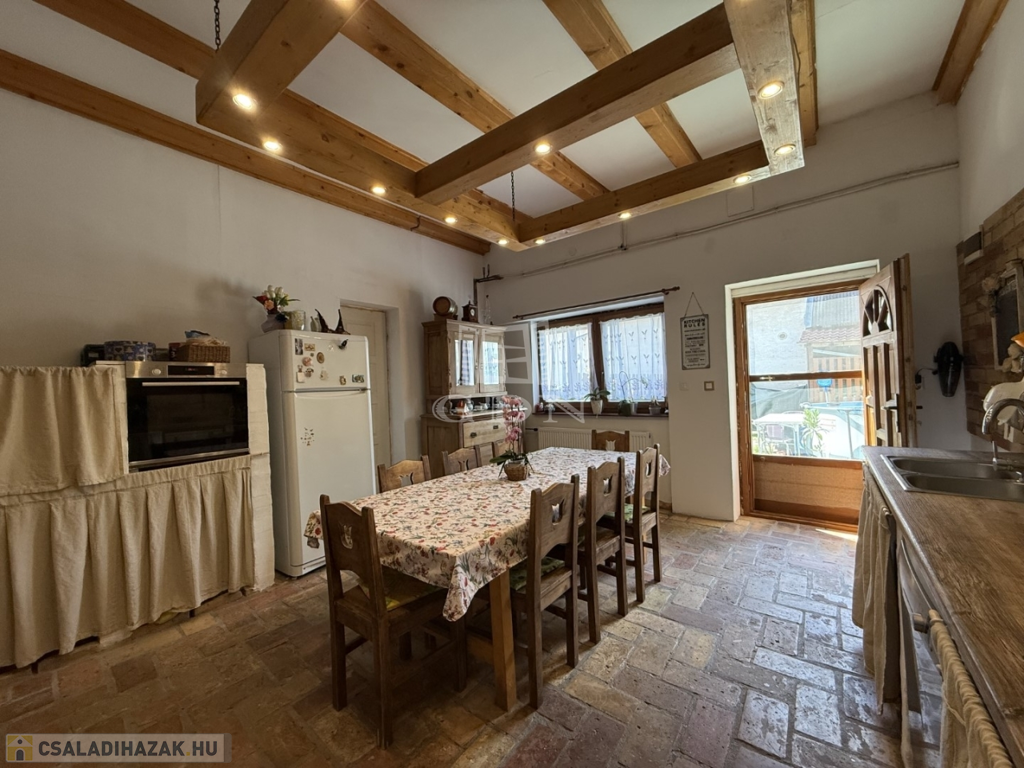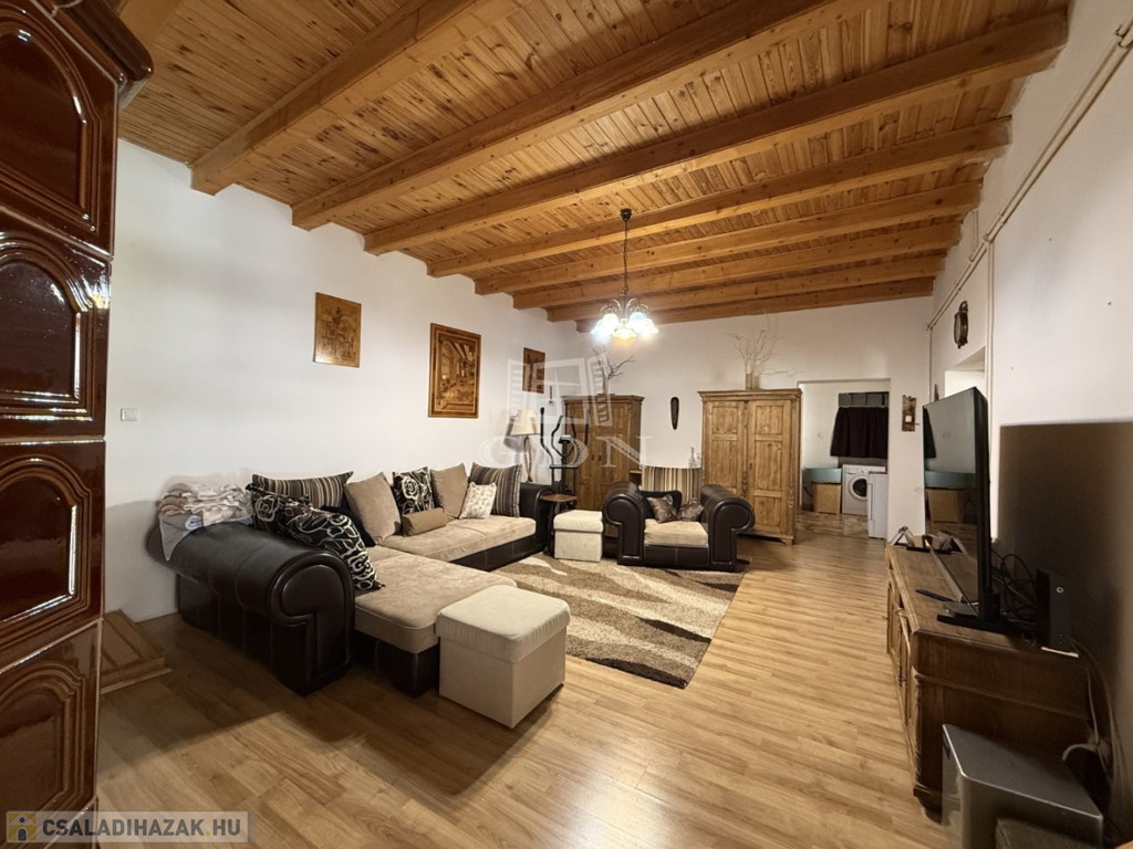 • Földszinti lakás (93 m²): rusztikus hangulatú, előszoba, konyha-étkező, tágas, világos nappali (35 m²), hálószoba, fürdő (zuhanyzós), külön WC, háztartási helyiség. Hangulatos, látszógerendás mennyezet és cserépkályha teszi különlegessé.