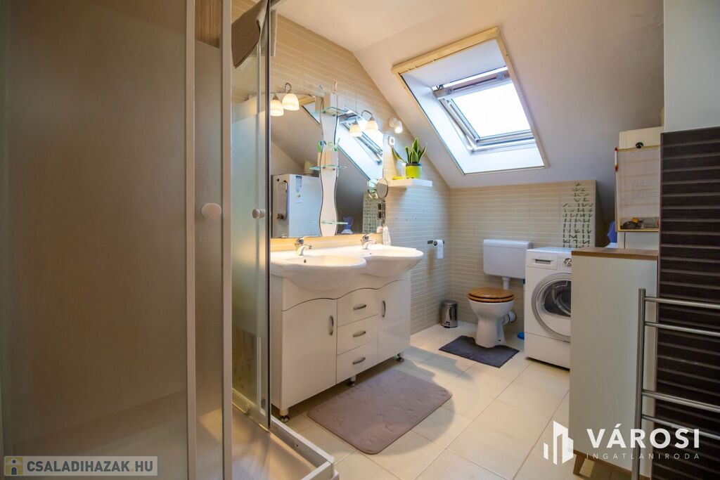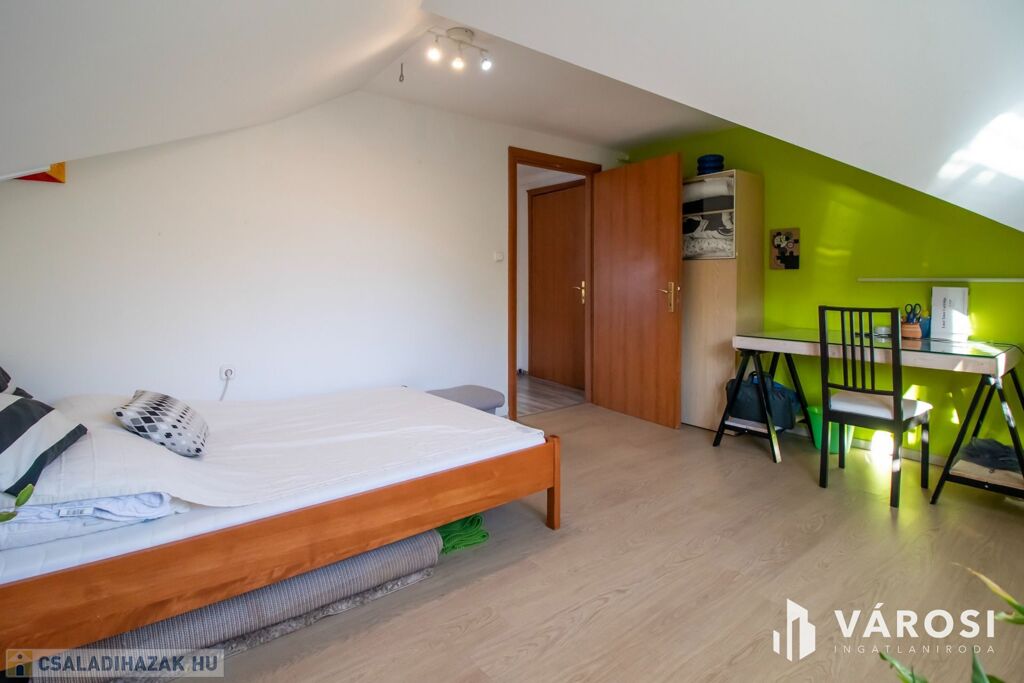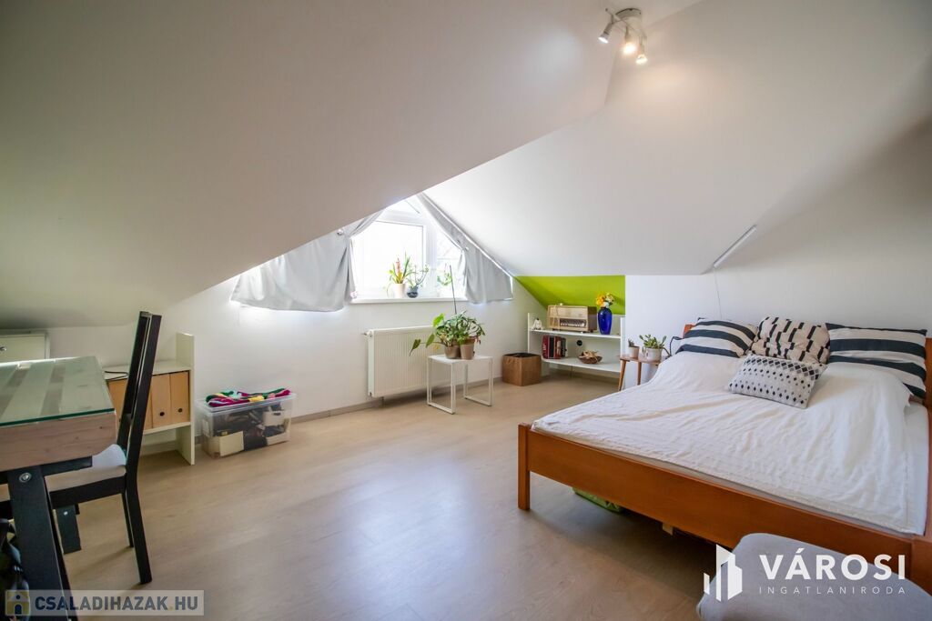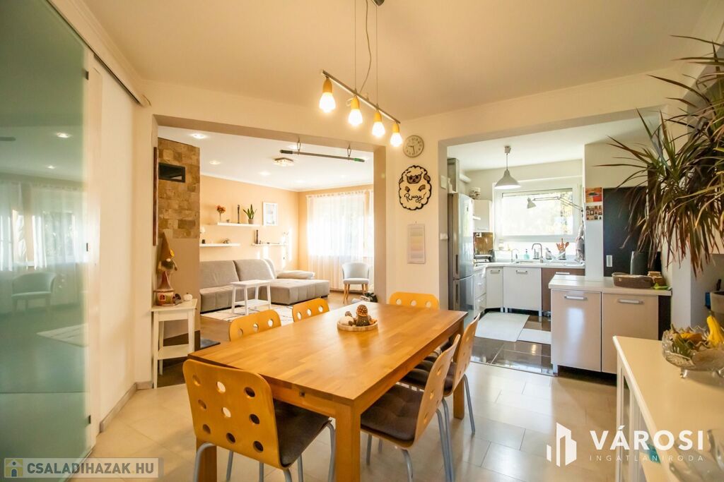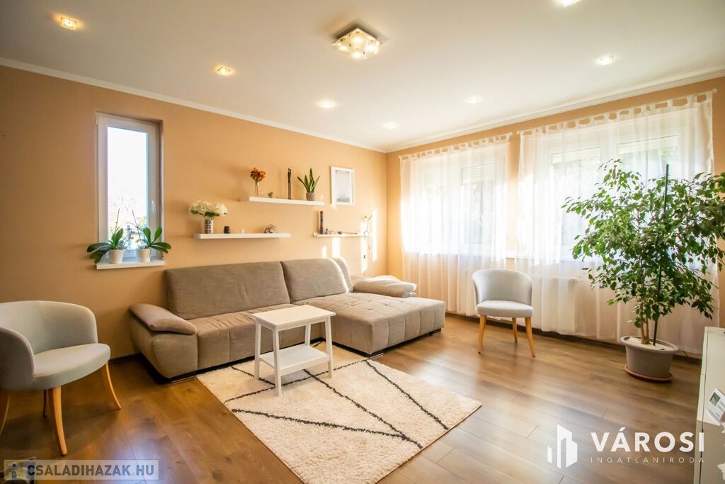 A ház 2001-ben nagycsaládosoknak készült, ezért a bruttó 225, nettó 200 négyzetméteren van benne az amerikai konyhás nappalin kívül még 5 külön hálószoba, 2 fürdőszoba, plussz egy külön WC és egy két autó beállása alkalmas, 32 négyzetméteres, fűtött garázs is. Udvar felől egy nagy, fedett terasz is lehetőséget nyújt a szabadban való pihenésre. 2013-ban történt egy felújítás és azóta is szinte új állapotban van.