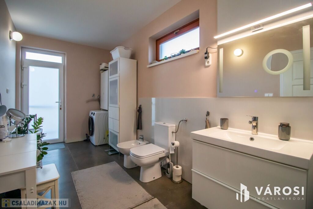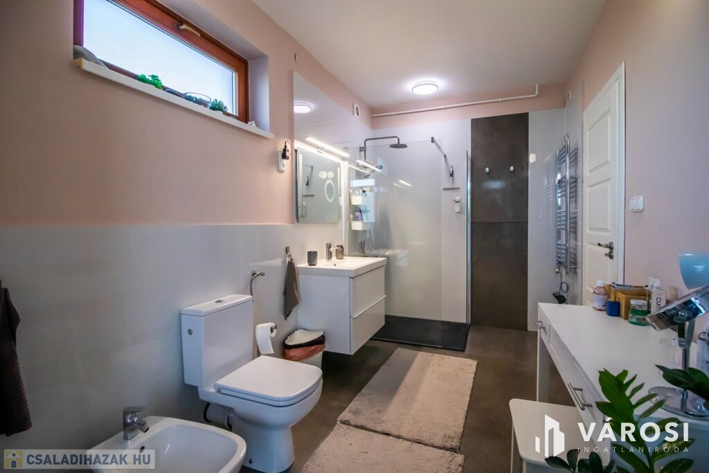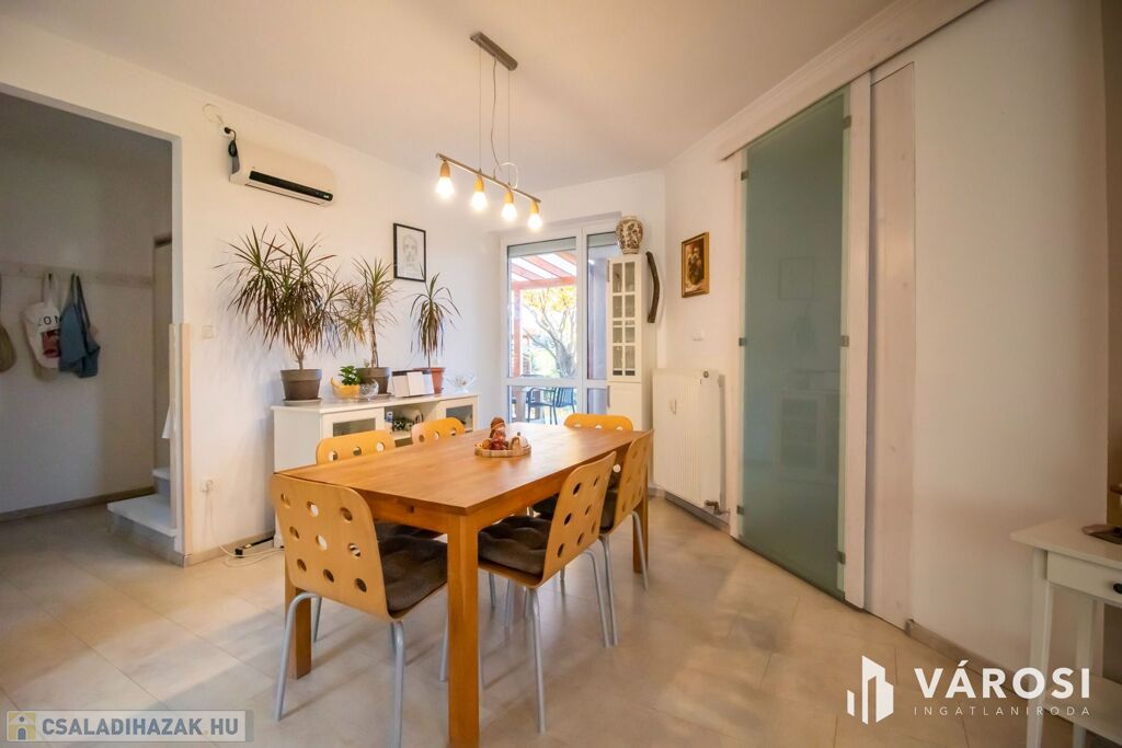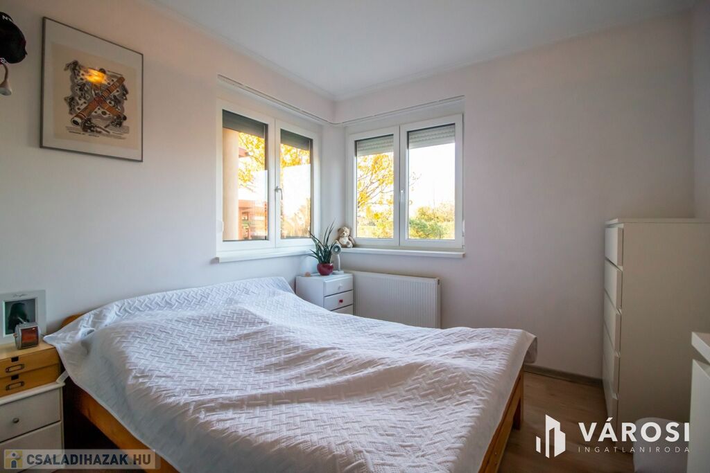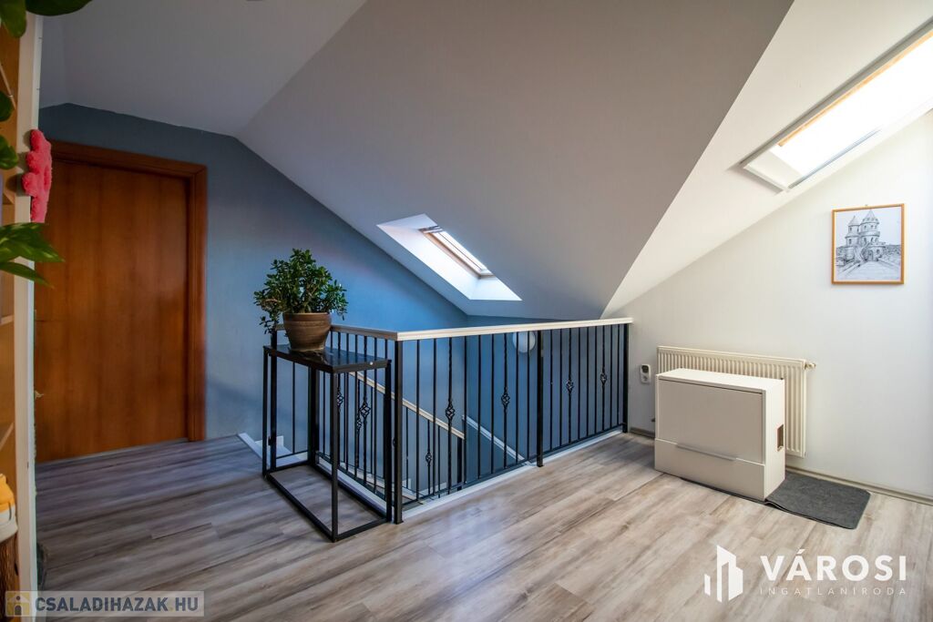 A ház 2001-ben nagycsaládosoknak készült, ezért a bruttó 225, nettó 200 négyzetméteren van benne az amerikai konyhás nappalin kívül még 5 külön hálószoba, 2 fürdőszoba, plussz egy külön WC és egy két autó beállása alkalmas, 32 négyzetméteres, fűtött garázs is. Udvar felől egy nagy, fedett terasz is lehetőséget nyújt a szabadban való pihenésre. 2013-ban történt egy felújítás és azóta is szinte új állapotban van.