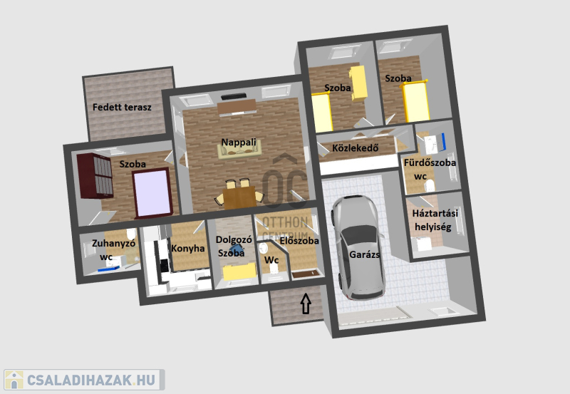 • garázs a házon belül egy járműnek, saját tárolóval