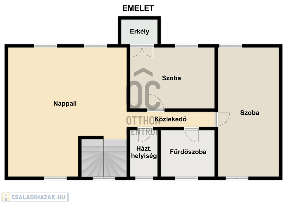 Emelet: 2 hálószoba, fürdőszoba, valamint egy 36 m²-es nappali (igény szerint 3 hálószobává alakítható)