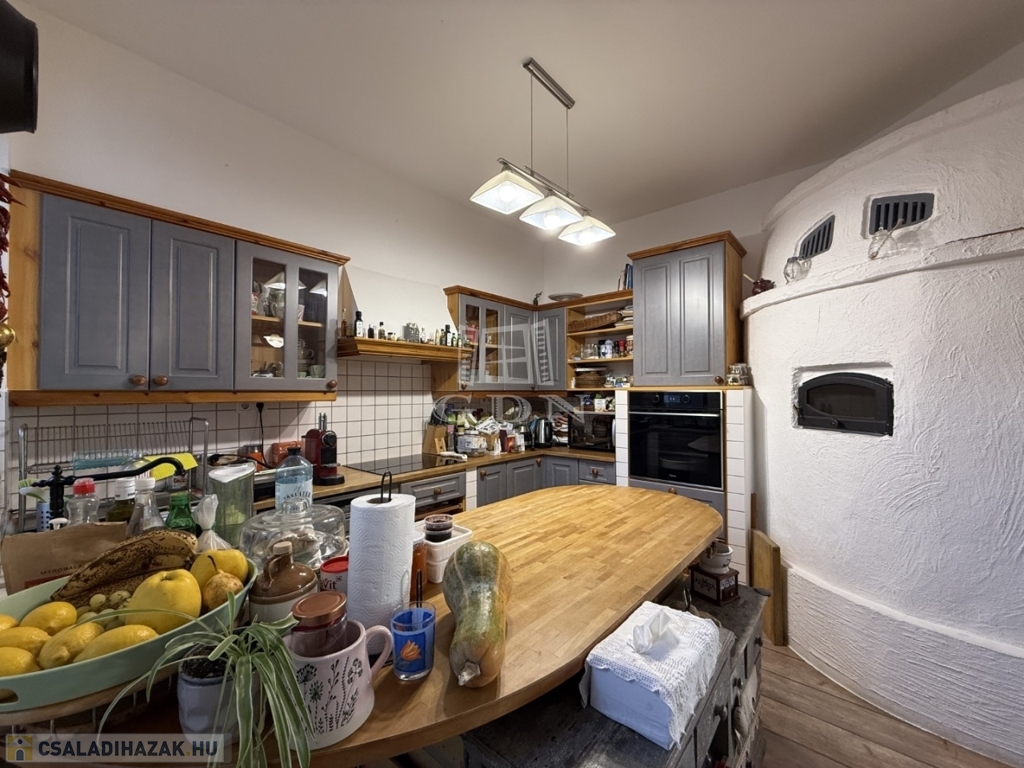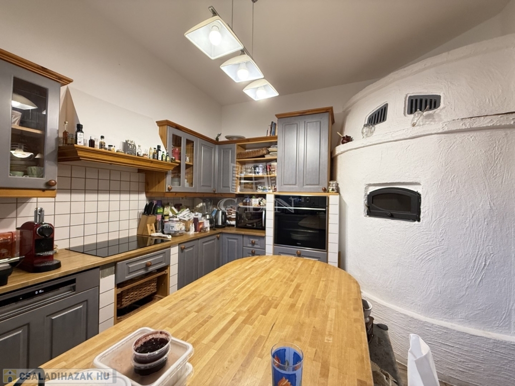 Az egyedi belsőépítészeti megoldások – többek között a konyhában található kemence – az otthonosság és a praktikum különleges összhangját teremtik meg.