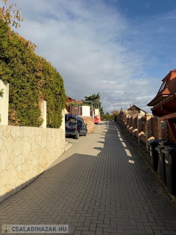 A 3047 m²-es, teljesen körbekerített telek gondosan karbantartott, rendezett. Az ingatlan egy 4 lakásos sorház középső lakása. A bejutás elektromos kapun keresztül, közös térkövezett behajtón történik.