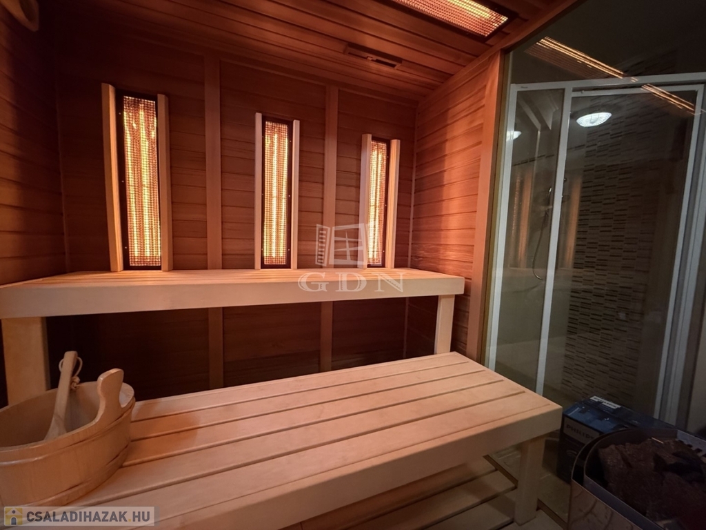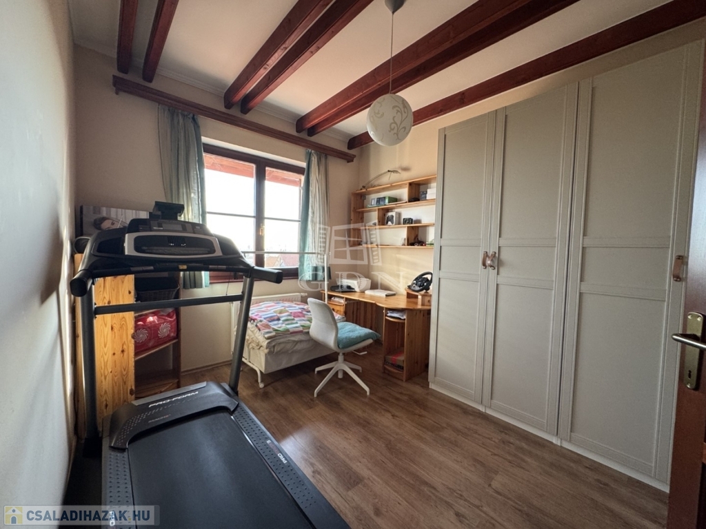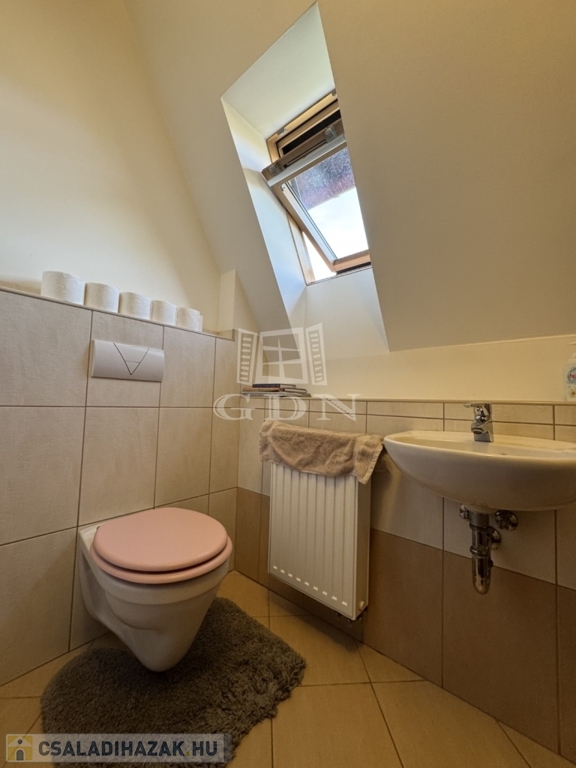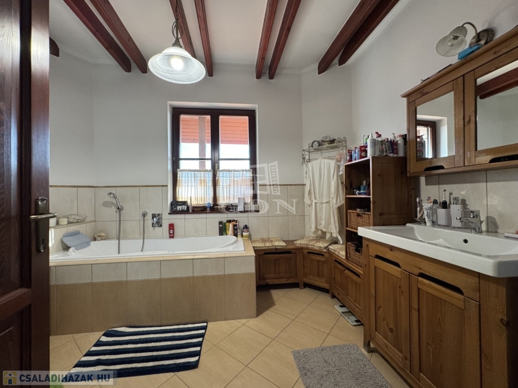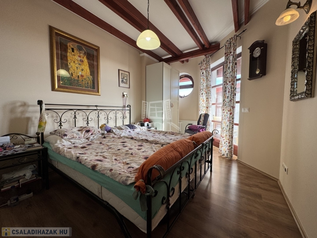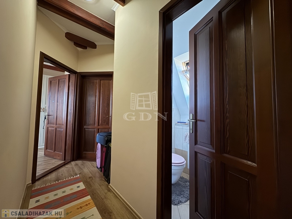 A kétrétegű üvegezésü, hőszigetelt nyílászárók, a magas minőségű hideg- és melegburkolatok, a dizájnos falpanelek, valamint a tetőtérben megjelenő látszógerendák természetes, elegáns megjelenést kölcsönöznek az otthonnak.