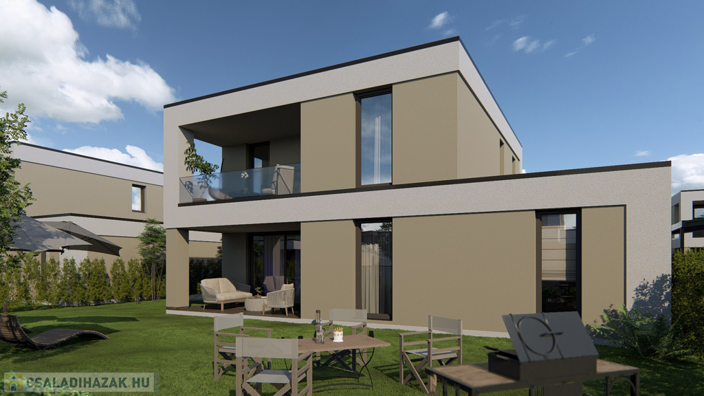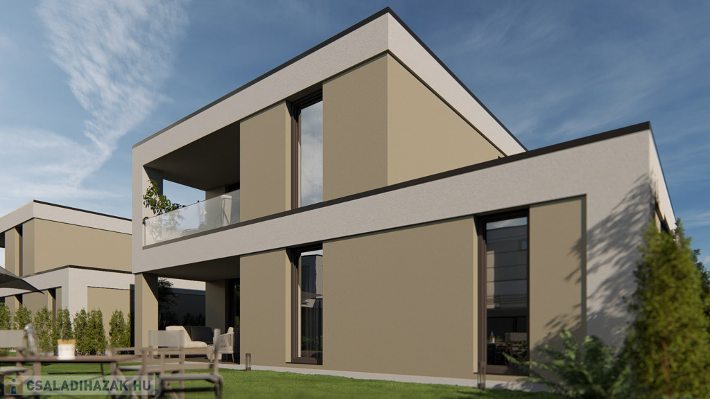 Székesfehérváron, az Öreghegyen eladó egy 2025/26-ban épülő, kétszintes, 163 m2-es modern családi ház. A ház földszintje nappali + 1 szobás kialakítású, étkező-konyhával, tárolóval, vendég WC-vel és előszobával. A szobához kapcsolódik egy gardrób szoba és egy privát fürdőszoba is. A nappalihoz egy terasz kapcsolódik. Az emeleti részen három szoba, fürdőszoba, előtér és külön WC található. Itt a két szobához szintén terasz kapcsolódik. A parkolásról egy 19,8 m2-es garázs és egy kültéri beálló is gondoskodik.