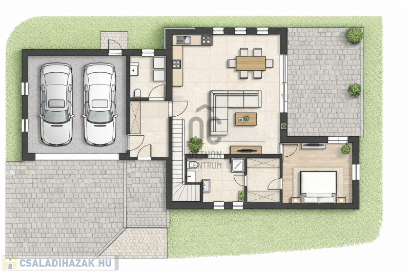 - Földszint: előtér, amerikai konyhás nappali étkezővel, hálószoba, gardrób, fürdőszoba, háztartási helyiség, garázs, terasz.